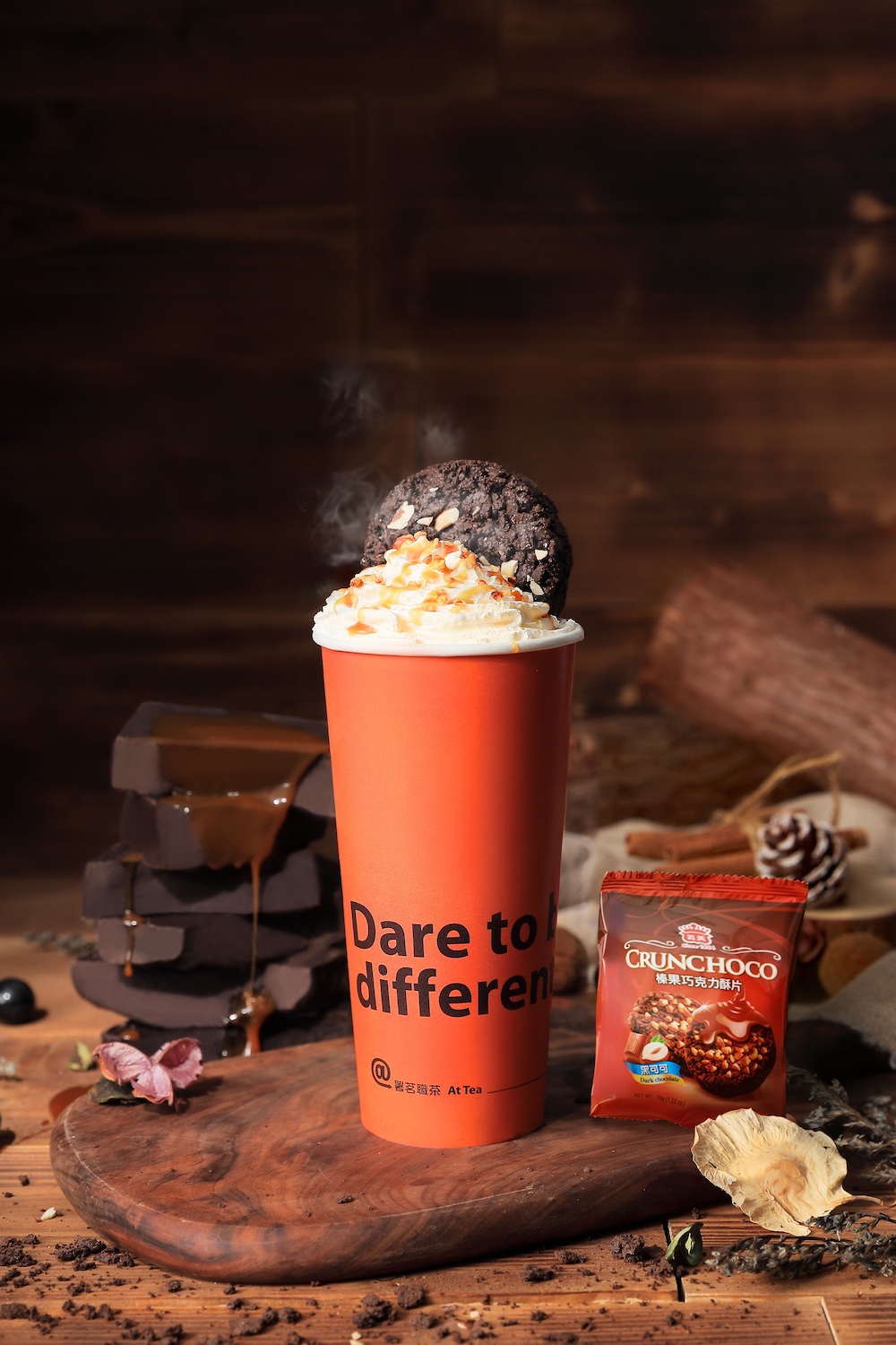 ▼以800次奶蓋飲品系列火紅的「署茗職茶@AtTea」,這次特邀熱銷35年的經典夯品「義美巧克力酥片」擔綱署茗職茶冬季新飲品主角,推出巧克力飲品「法式雲朵可可脆餅」,選用法國Monbana精品可可及紐西蘭恆牧鮮乳創造出溫潤濃郁巧克力飲,並擠上滑順香草奶霜,再澆淋焦糖與蕎麥脆粒,讓口感層次更加豐富,最後擺上完整的義美榛果巧克力酥片,搭配簡約時尚的新款橘色紙杯,整杯飲品宛如手拿聖誕樹,節慶幸福感十足!此款期間限定飲品預計12/4 溫暖開賣,單杯售價NT$95。