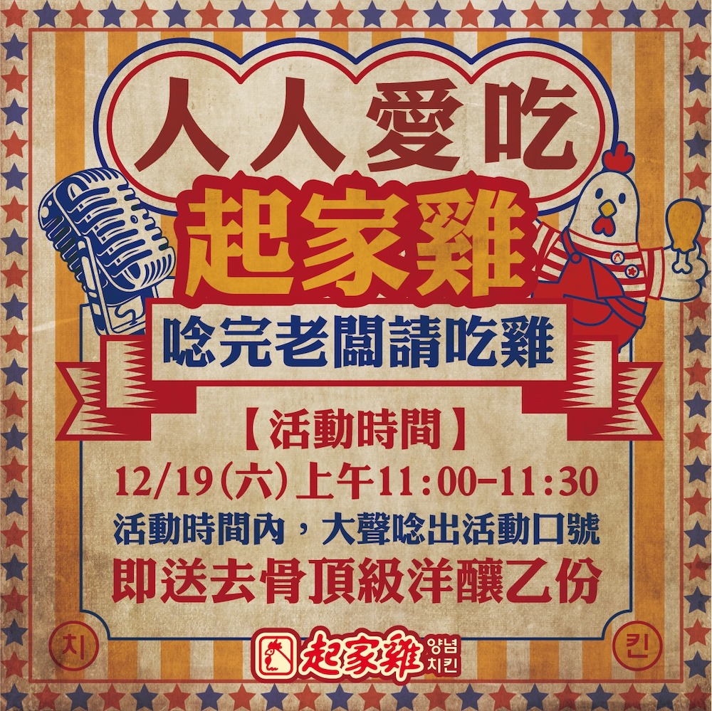活動辦法:30秒內完成指定28字繞口令「人人愛吃起家雞,新鮮雞肉吃得起,寶島市民添口福,唸完老闆請吃雞」就可免費獲得一份人氣的「去骨頂級洋釀」