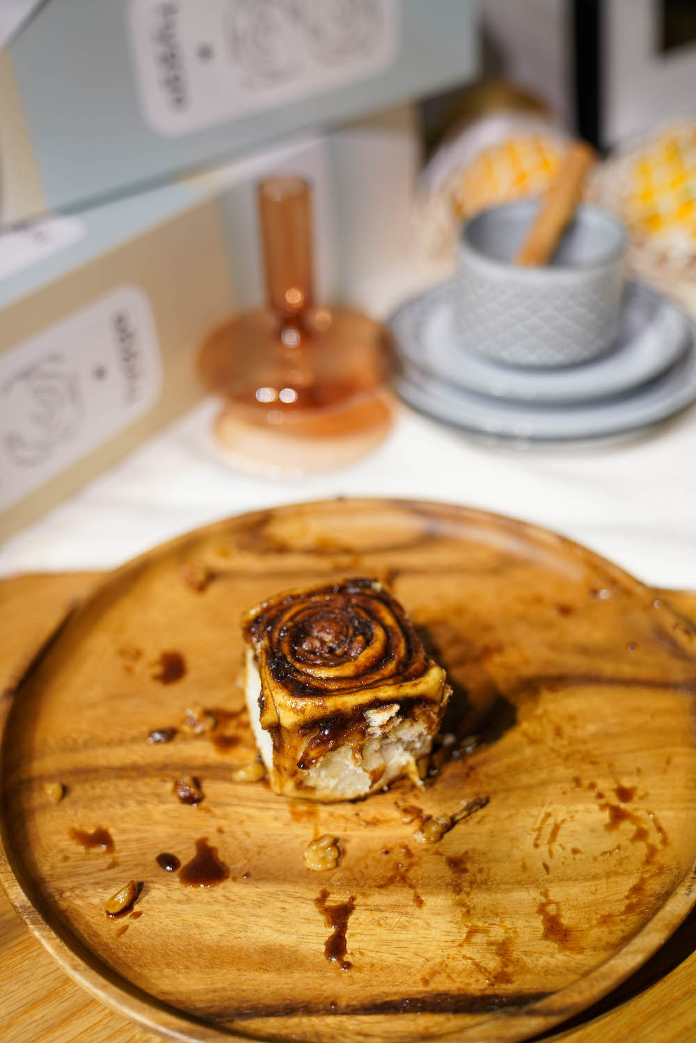 內容物:五間店( Fly Cafe、Miss V Bakery、Purebread Bakery、珠寶盒法式點心工作坊、呷滴 Jia Dee)各一顆肉桂捲、一枚紀念磁鐵、精美提袋與禮盒。