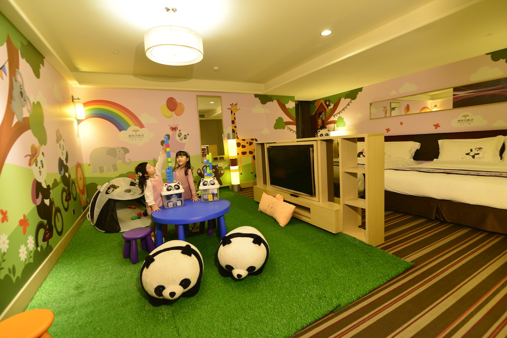 ▼福容大飯店台北二館推出「貓熊趴趴GO 福容樂享受」主題套餐及主題房專案,入住全館唯一貓熊主題家庭客房,不僅能與貓熊家族一同入睡,房間內處處皆是驚喜,一進房玄關處便有可愛的貓熊氣球,牆面上有綠油油的草地,圓仔、圓寶與好朋友們悠遊自在地玩耍。
