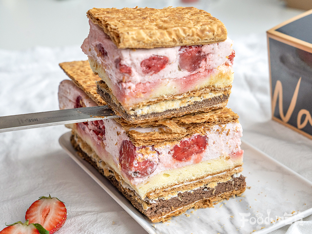 ▼首先要來介紹的就是這款超浮誇的「爆量草莓拿破崙」,你沒看錯,這款千層蛋糕中加入了大湖直送的海量草莓以及天然自製的草莓果醬,酸酸甜甜的口感真的讓人欲罷不能啊~而「爆量草莓拿破崙」的千層外皮酥酥脆脆,一口咬下是鬆軟的海綿蛋糕配上超有份量的草莓慕斯,豐富又有層次的口感叫人怎麼能不愛~