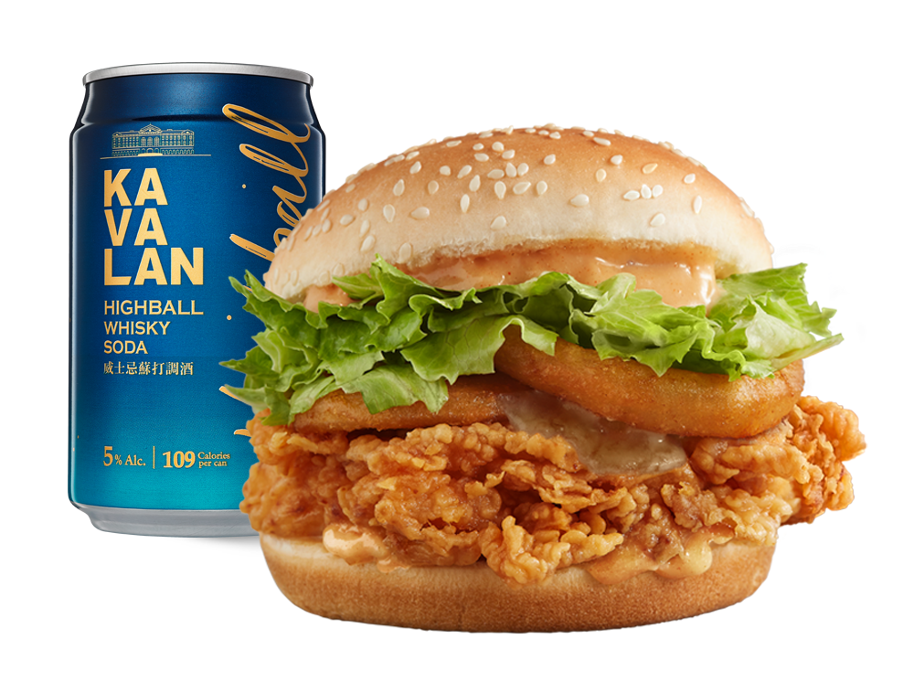 ▼此外,更特別推出聯名特餐,享受多層次的噶瑪蘭威士忌咔啦雞腿堡之餘,一邊小酌噶瑪蘭調酒Highball威士忌蘇打,美味與微醺一次滿足!