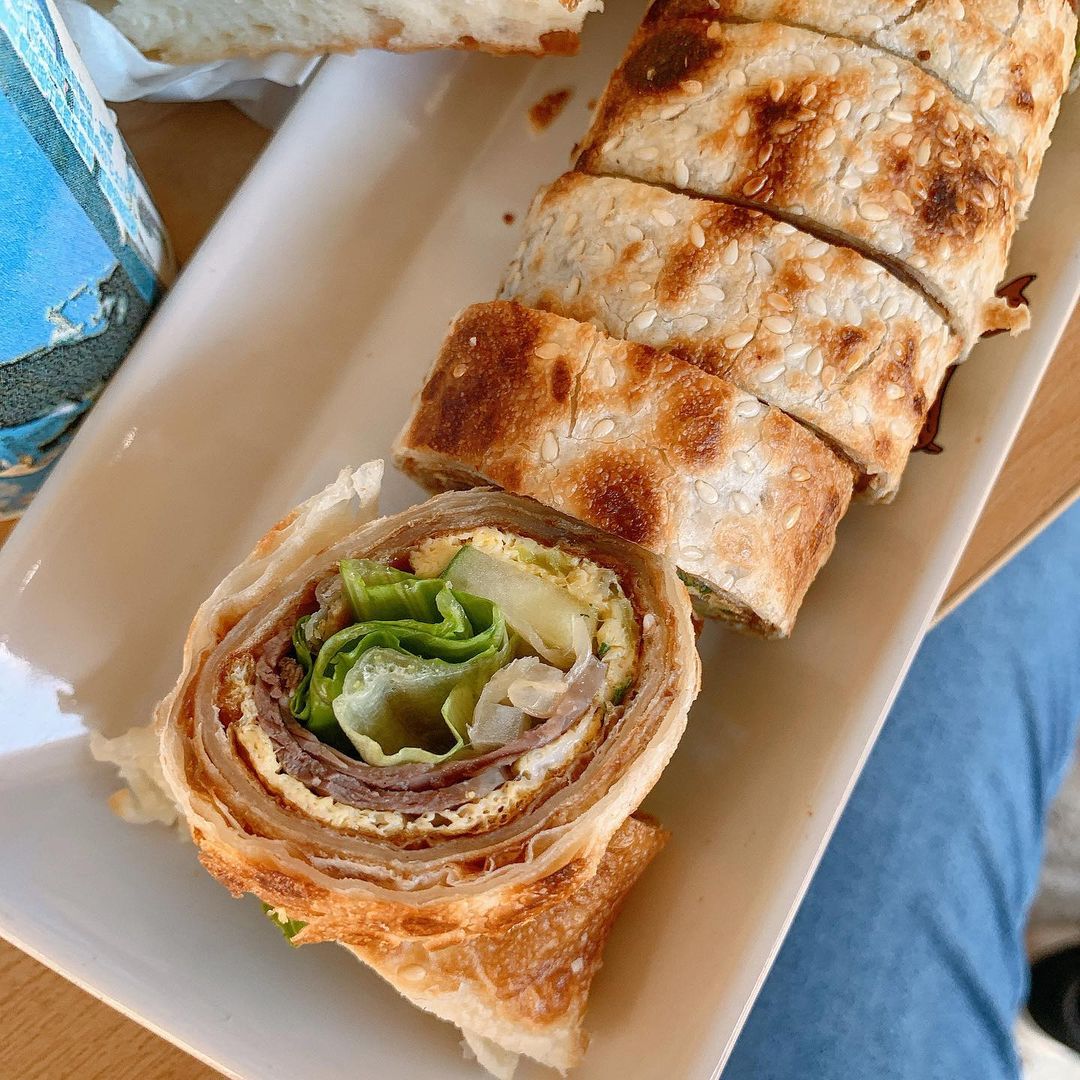▼另外一款必吃的就是「牛肉捲餅」,包入牛肉、蛋、蔬菜,外觀超飽滿,外層同樣煎得酥脆焦香,內層捲餅皮則帶有嚼勁,搭配鹹香牛肉、滑嫩的煎蛋與爽脆青菜,醬汁鹹中帶甜,跟捲餅皮、牛肉都超搭,吃起來清爽不膩又滿足!