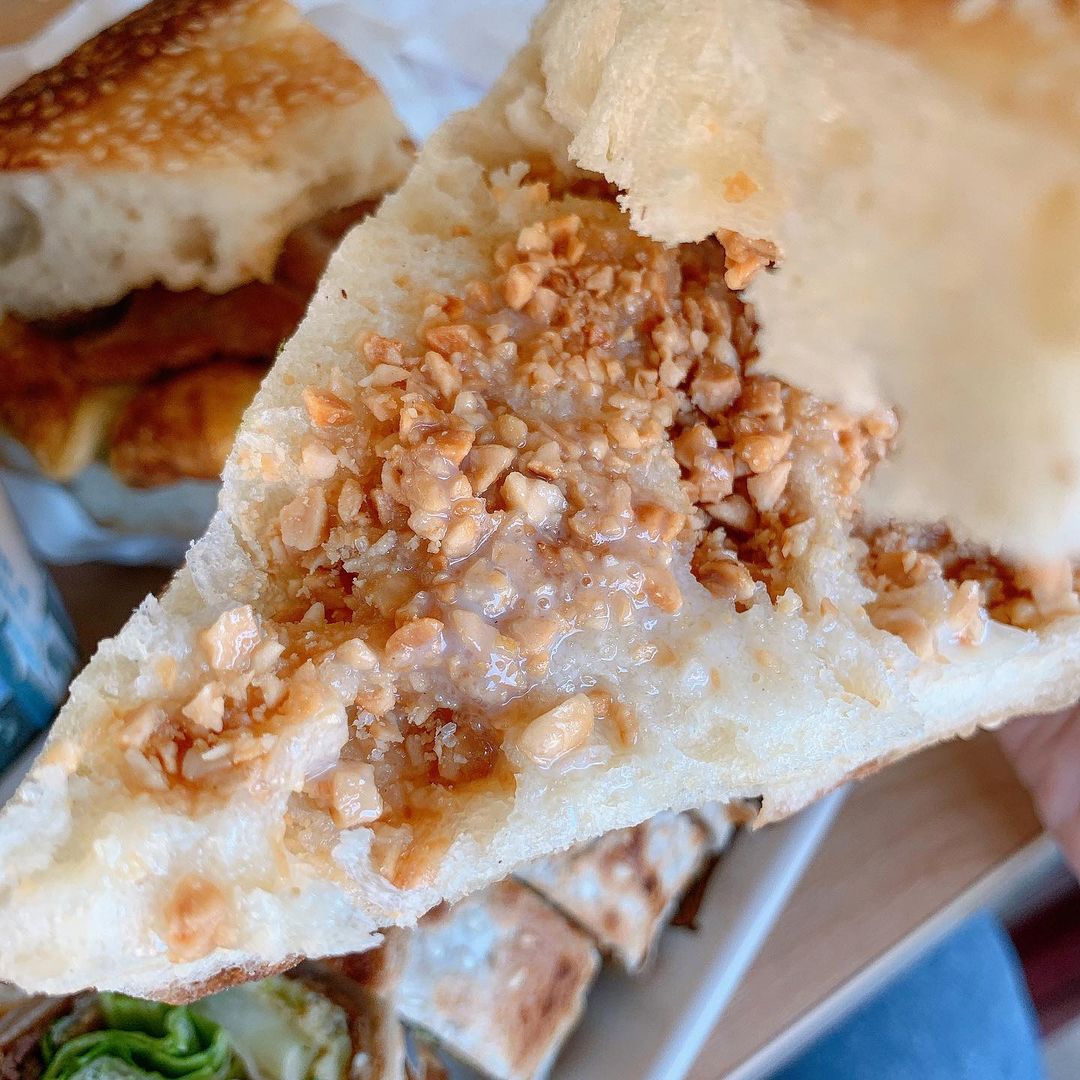 ▼喜歡吃甜甜的人,「老爹手工蔥大餅」也有賣經典「甜大餅」,本身甜餅的麵香清甜就已經很美味,再加入花生粉、碎花生粒、練乳等,超完美的小點心讓人一口接一口吃得超開心~