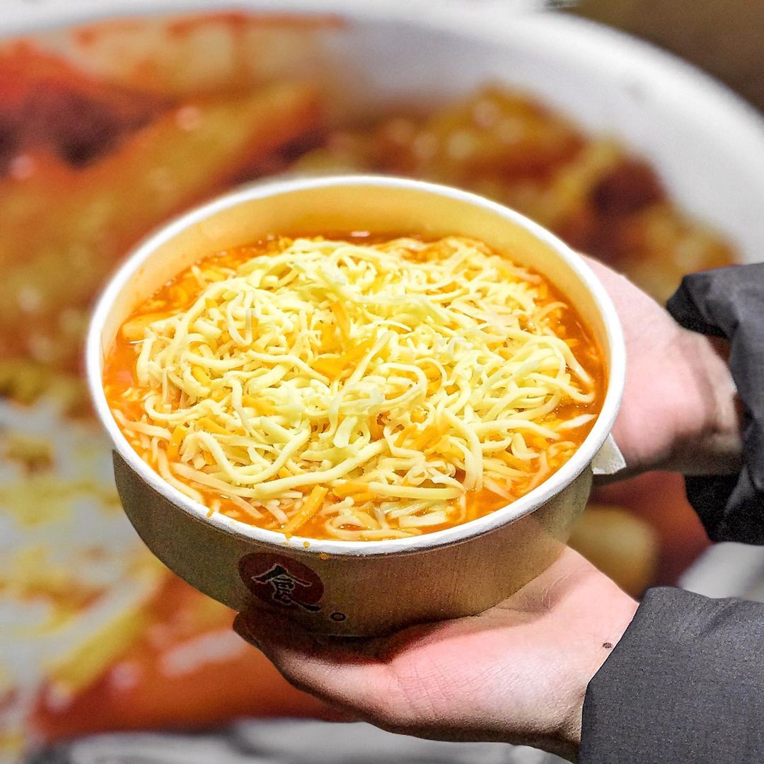 ▼人氣招牌必點就是這道「起司拉麵年糕」(售價 120元),看看這滿到看不見泡麵的起司量,加熱過後,每一條拉麵都裹上厚厚的起司,筷子一夾就是療癒的牽絲,配上QQ的年糕、魚板一起吃,偏辣的口味讓你一吃就停不下來!