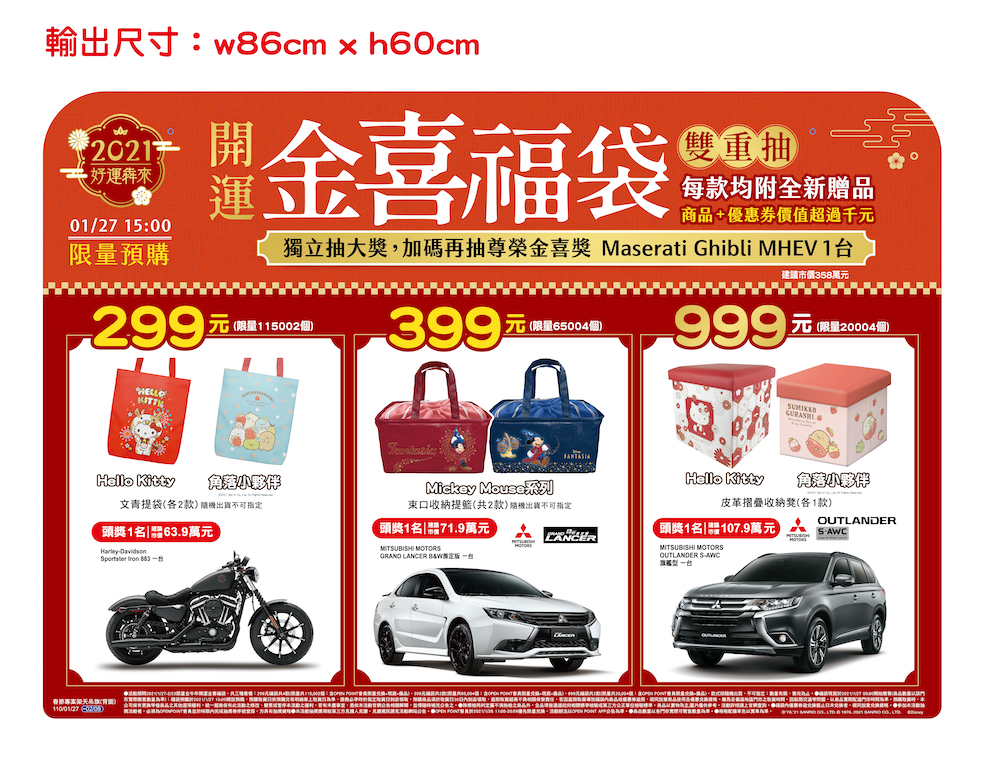 ▼限量2021金牛年開運金喜999元福袋,同樣有Hello Kitty、角落小夥伴兩款(限量共20,004個),還能抽市值107.9萬的「MITSUBISHI MOTORS OUTLANDER S-AWC旗艦型」!