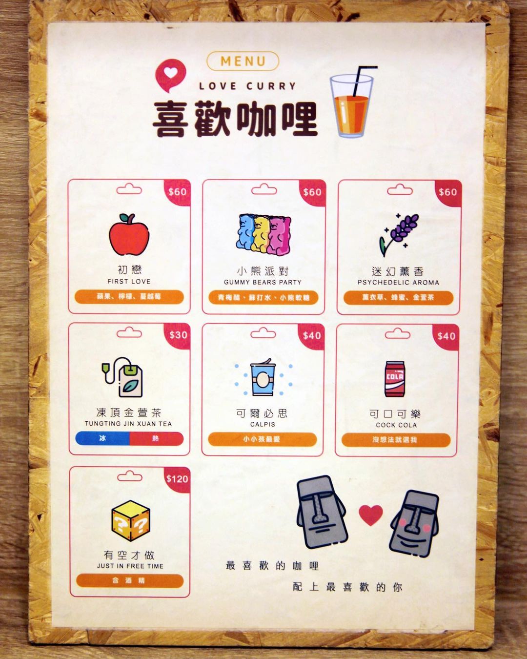 💰牛肉咖哩$180、豬肉丸咖哩$170、雞肉咖哩$160、迷幻薰香$60、初戀$60