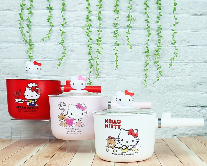 ▼「Hello Kitty個人電煮鍋 $1280元」 共3款 (粉、紅、白色) ,簡單的2段式開關,防乾燒裝置,kitty造型頭型鍋蓋柄,煎、煮、悶、燉,讓煮食變得簡單,陶瓷釉油不沾鍋塗層通過SGS檢測,符合標準,讓您輕鬆享受美好食光、暇意生活!(2021/01/27 上午11:00起開始預購)