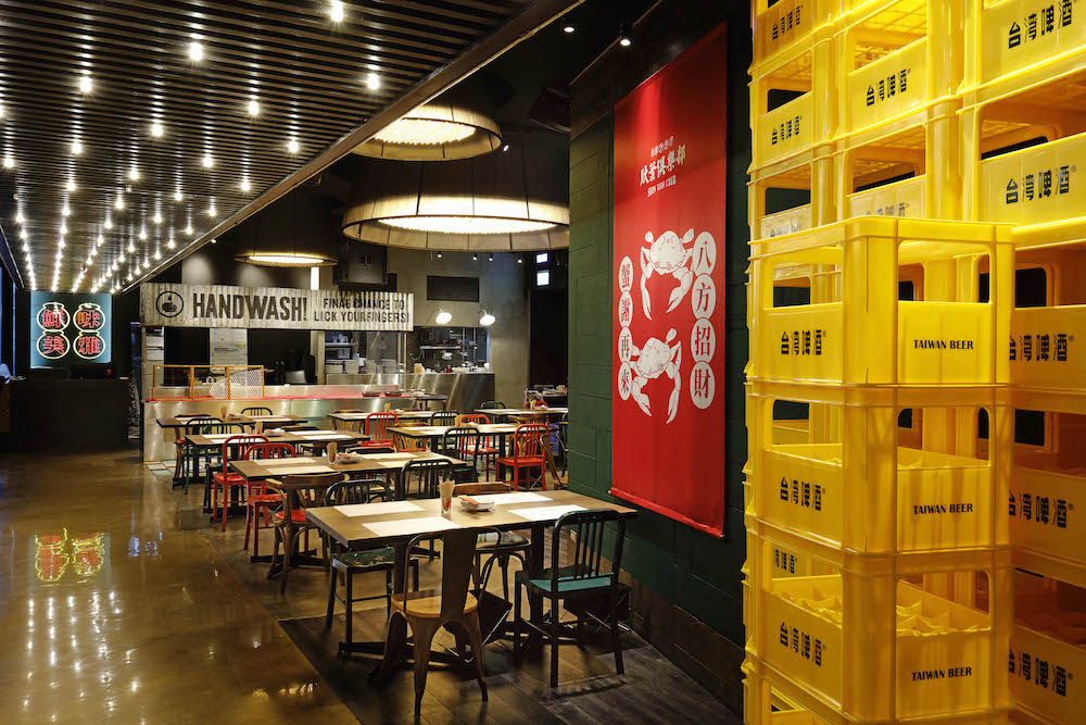 ▼懸掛牆面的大布旗以螃蟹、雞等圖案呼應「紅蟳米糕」、「三杯雞」等餐桌常見菜色,外帶飲料包裝則與夜市撈金魚提袋造型近似,充滿了台灣日常生活的趣味。