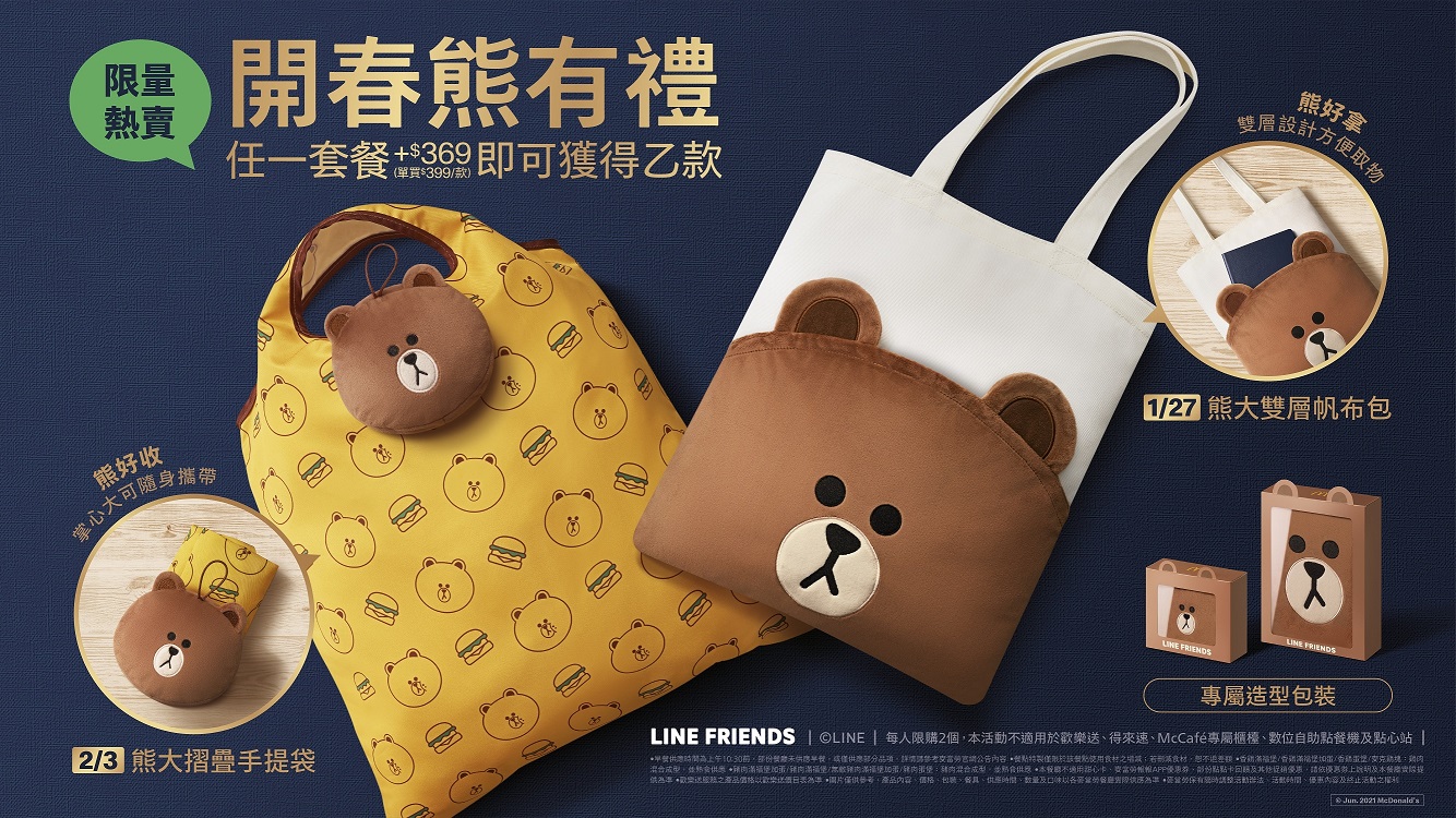2021年01月25日最可愛的熊大來麥當勞了!農曆新年將至,您是否有特別感謝的人呢?台灣麥當勞和LINE FRIENDS攜手合作,將推出全台限量兩款共6萬5千組的「熊大雙層帆布包」和「熊大摺疊手提袋」,絕對是新春送禮的神器~不只如此,1月27日起麥當勞「金迎招財薯來堡」與「金迎招財福堡」再度好運回歸,同場加映暖心的人氣季節點心「紅豆派」,粉絲們千萬別錯過!