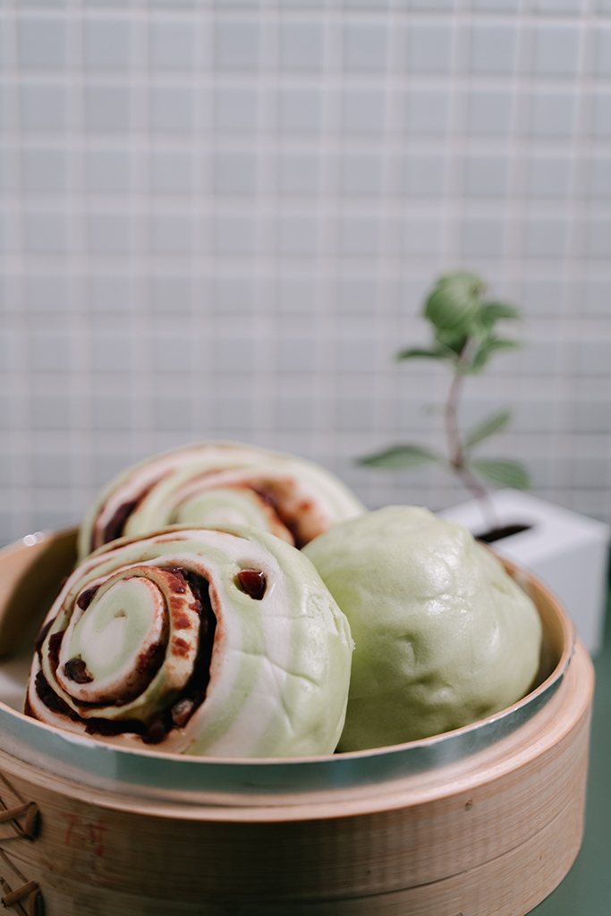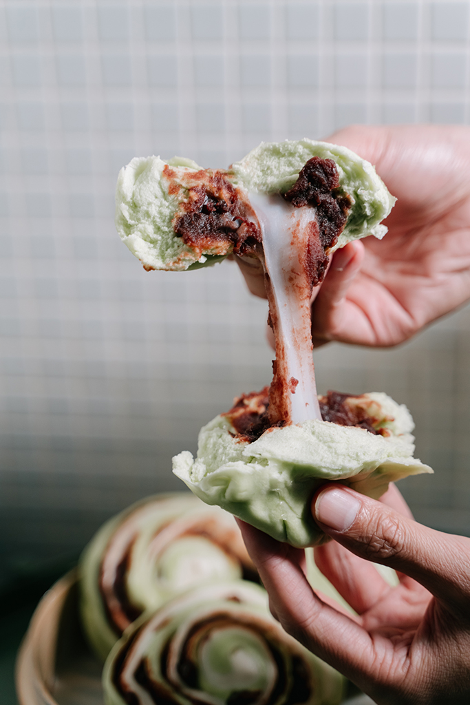 ▼「雙木林包子饅頭店」也推出了抹茶紅豆捲和抹茶紅豆麻糬包,麵糰是由麵粉、糖與牛奶簡單三元素製成,口感鬆軟Q彈~抹茶包子的內餡香甜,將紅豆配上牽絲麻糬真的太療癒!