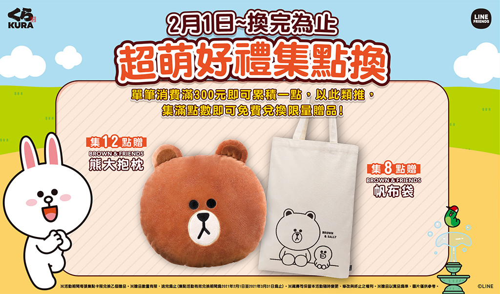 ▼除了限定扭蛋外,藏壽司更加碼推出限量滿額集點活動,凡是來店消費滿300元即可獲得一點,集滿8點就能把顏值與實用兼具的BROWN & FRIENDS帆布袋帶回家,集滿12點則能獲得毛絨絨的熊大抱枕。LINE FRIENDS與藏壽司合作的限定系列好禮,數量有限送完為止,大家趕緊揪團前往藏壽司用餐吧!