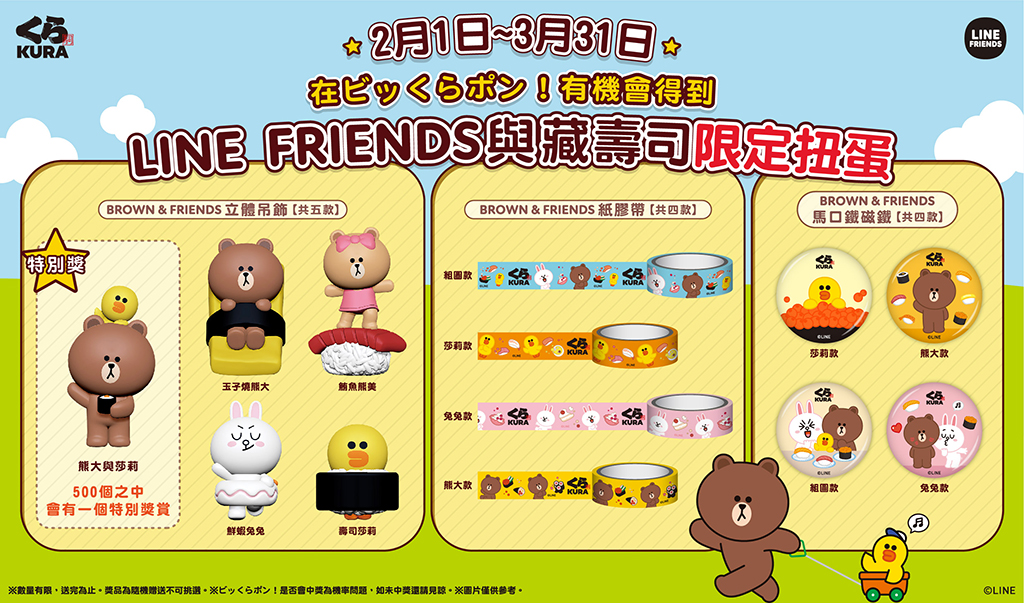 ▼農曆新年即將到來,藏壽司從2月1日起至3月31日與LINE FRIENDS合作推出限定扭蛋,將深受大小朋友喜愛的原創角色變身13款限定扭蛋,陪伴民眾度過溫馨的年節用餐時光。