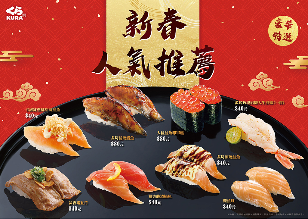 ▼金牛年即將到來,藏壽司為了陪伴饕客們度過美食不間斷的過年時刻,特別公布新春推薦菜單,讓壽司控在春節期間也能大飽口福!其中,高人氣的「炙烤玫瑰岩鹽大生鮮蝦 $40」,以喜馬拉亞岩鹽和烈火,徹底釋放蝦子的鮮甜;而「炙烤蒲燒鰻魚 $80」則用軟嫩的魚肉搭配獨特的炙烤技術鎖住蒲燒醬汁,不禁讓人一口接一口大快朵頤。此外,濃郁的「蒜香豬五花 $ 40」以特製甜鹹醬佐上大量蒜片,是不可錯過的開胃料理。藏壽司新春推薦菜單提供台灣民眾不一樣的年菜新選擇,讓年節期間徜徉於海鮮甘甜滋味無法自拔!