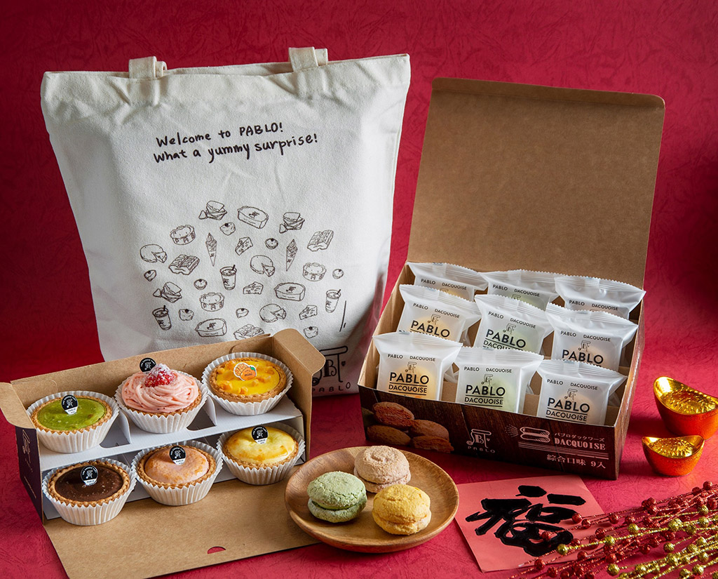 ▼而在2/10起也推出「新春滿福包」發發發福袋組合,各店限量50組(汐止、美麗華快閃店各限量20組),開運價每組售價888元,售完為止。福袋內容包括將暢銷的經典杏桃起司原味、日式濃郁抹茶、草莓口味三款大塔的內餡、起司奶油及特色風味融入於夾層中,再經過烘烤酥酥脆脆外層的達克瓦滋禮盒1盒(綜合口味9入/原售價$358)、任選6入迷你起司塔(原售價$408~$528)、1個PABLO經典時尚托特包(原售價$188)福氣組合,最高可省下186元近8折的超值組優惠,非常適合年節送禮。
