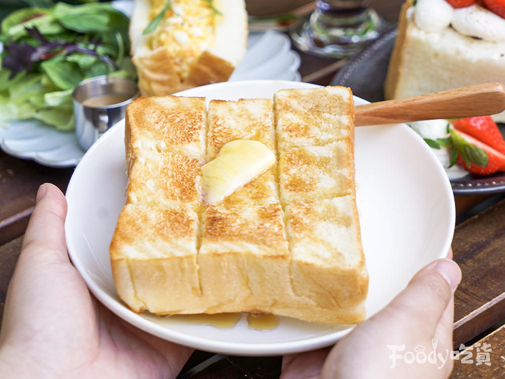 ▼「蜂蜜鹽奶油烤吐司」則選用了店家自製的生吐司,厚切後微烤至外酥內軟,淋上龍眼蜜搭配鹽味奶油,涮嘴的程度讓人忍不住一口接一口~