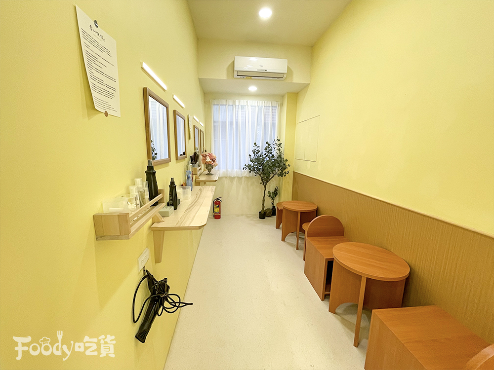 ▼「春山Dessert」店面吸睛的奶油黃色牆面外觀,就足以吸引路人駐足停留,不管是窗邊的折疊椅,還是店門口旁的拍照牆,每個角度都好拍到不行!店內風格同樣以暖黃色調為主,裝飾風格也是以女孩們最愛的韓式風格,來到這裡彷彿走到韓國街邊的午茶館,給人一種放鬆舒適的氛圍。