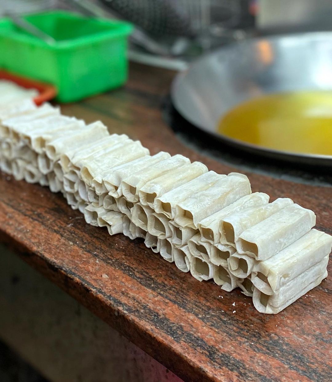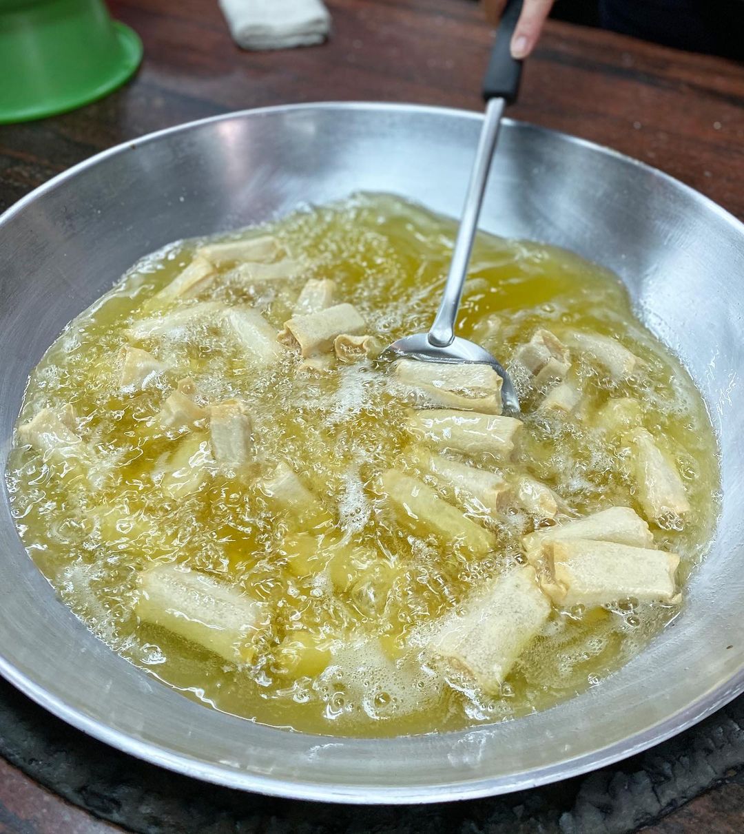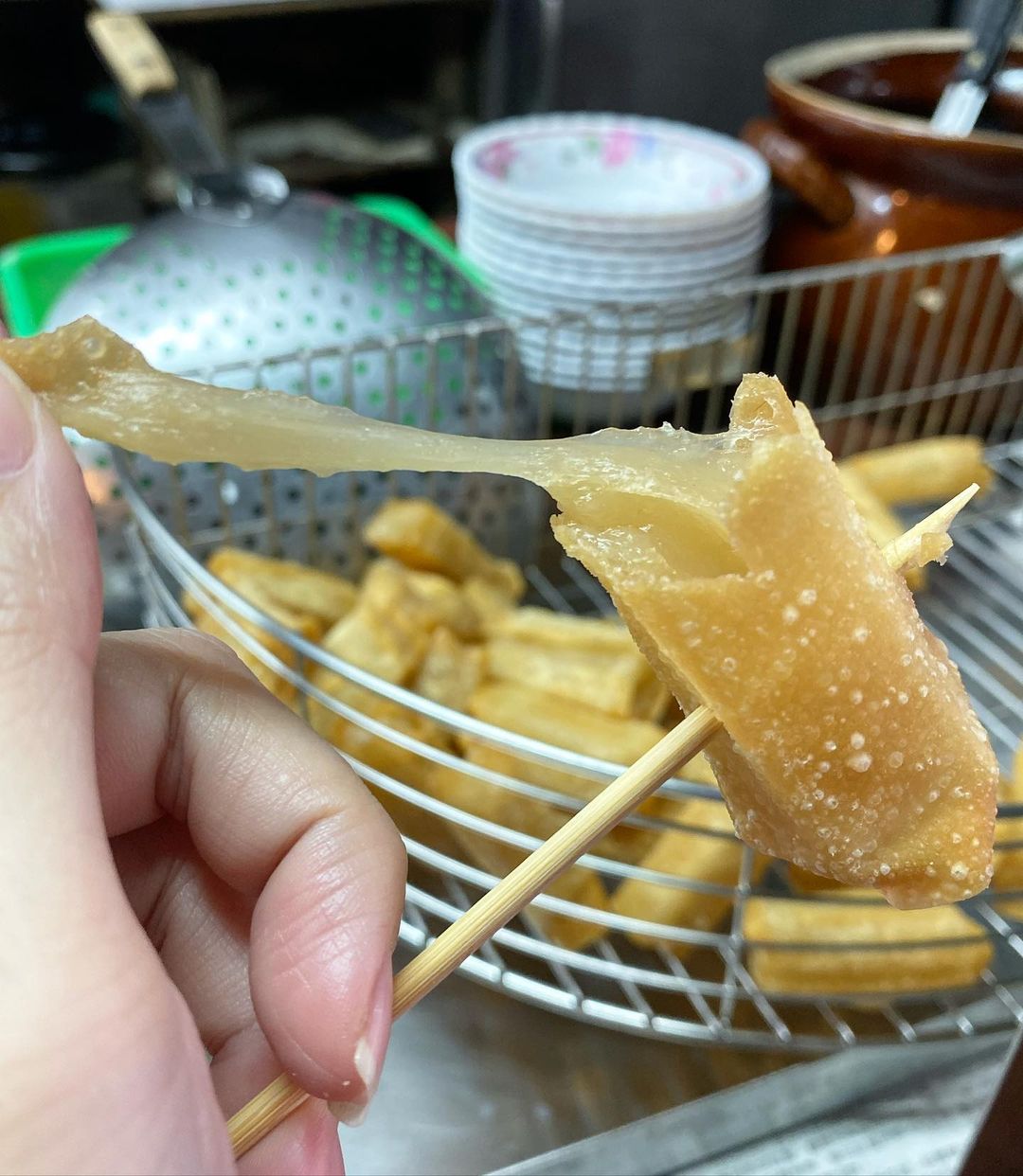 ▼在油鍋裡上色至完美金黃色,滿滿「年糕餡」整個滿出麵皮,外層酥脆而內裡Q嫩中帶微黏的牽絲口感,熱騰騰的軟糯年糕一根根越吃越涮嘴,根本停不下來啊!