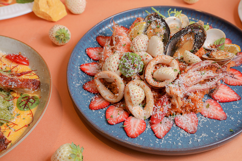 ▼第三款主廚以白草莓入菜,將經典海鮮燉飯再升級,「海莓好」選用蝦子、淡菜、透抽及蛤蠣等海鮮,與新鮮草莓及Q軟彈牙的泰國米一同拌炒,再加入義大利香料及匈牙利紅椒粉依秘製比例調味,最後再將新鮮草莓切片沿盤裝飾,海鮮的鮮味與草莓酸甜完美相契,嚐一口就停不下來。