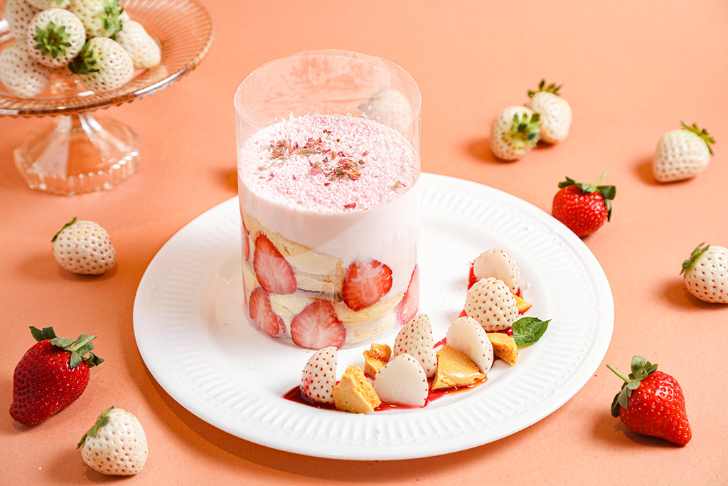 ▼夢幻白草莓季共推出四款新品,草莓甜點杯-「白富美」,杯內填滿布蕾、瑪斯卡彭乳酪、新鮮草莓、舒芙蕾與焦糖脆,除了視覺之外,味覺與口感也極富層次,最後以鮮奶油及白草莓堆疊裝飾,從上俯視就像戴著精緻雪白的皇冠,呈現白富美的優雅姿態。