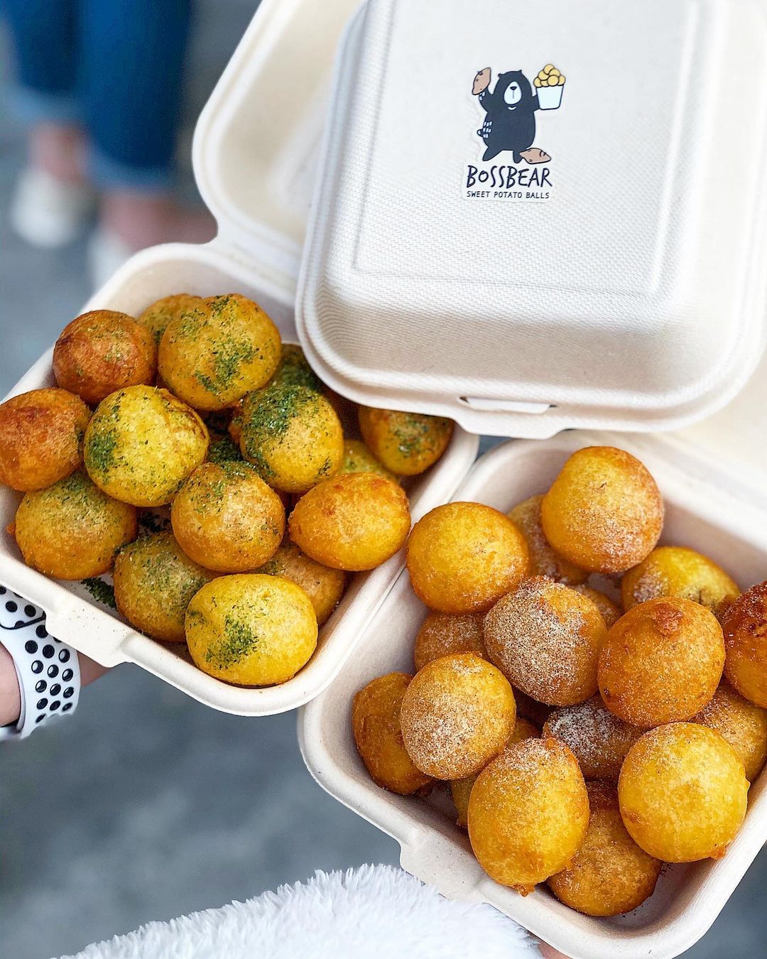 ▼大朋友小朋友都最愛的地瓜球,這一次來個超質感進化,用漢堡盒盛裝,盒子上更有可可愛愛的「熊老闆」在吃地瓜球,每盒裝滿滿超好拍。