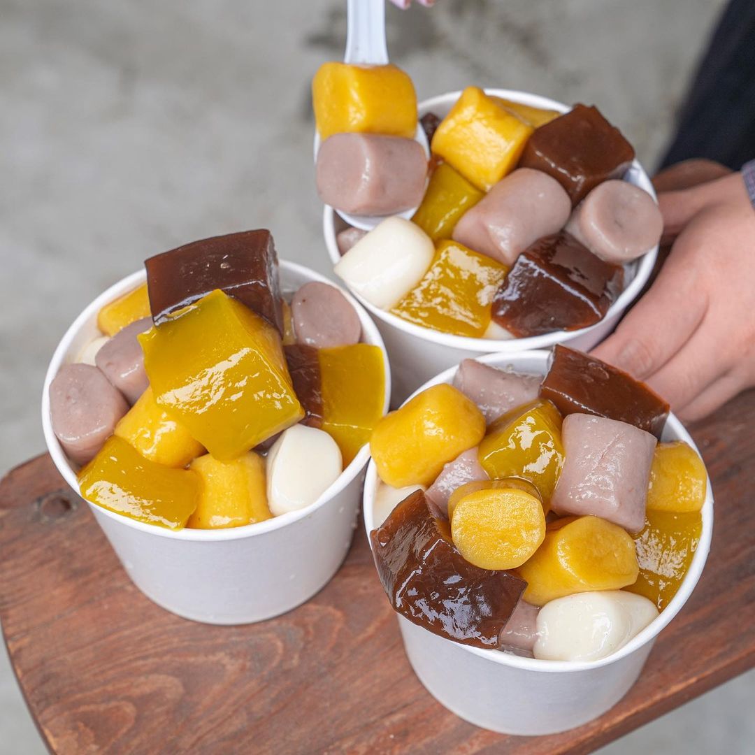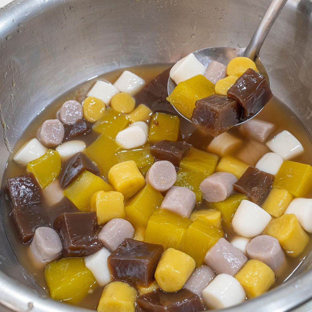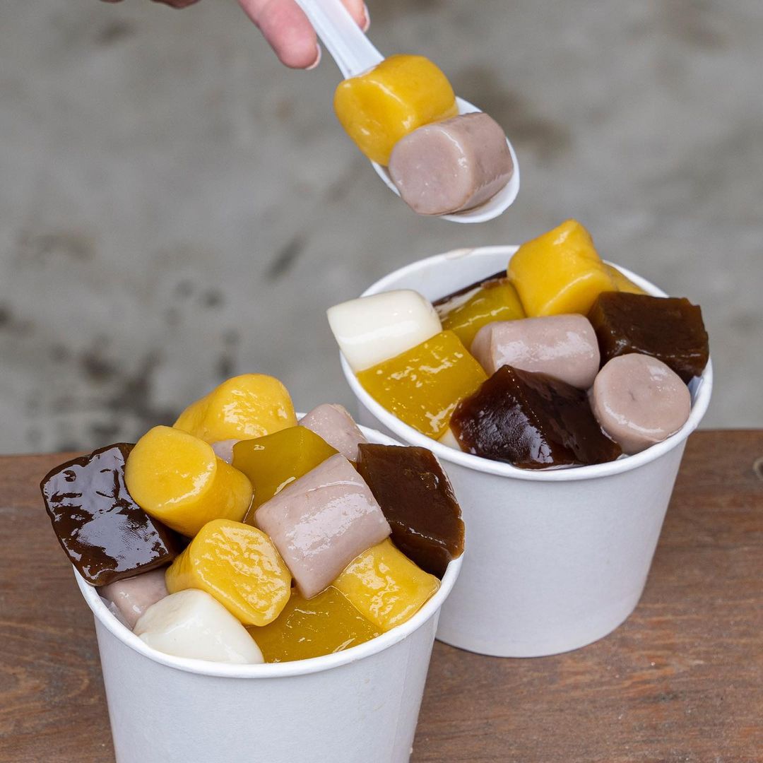 ▼綜合冰湯底可以選擇仙草湯、紅豆湯或綠豆(蒜)湯,大熱天來吃一碗肯定超消暑又滿足~如果吃不夠對話,還可以跟店家購買一整盒原味粉粿(NT$ 100)或黑糖粉粿(NT$ 120),不論是沾糖吃還是配牛奶一起吃都很適合!