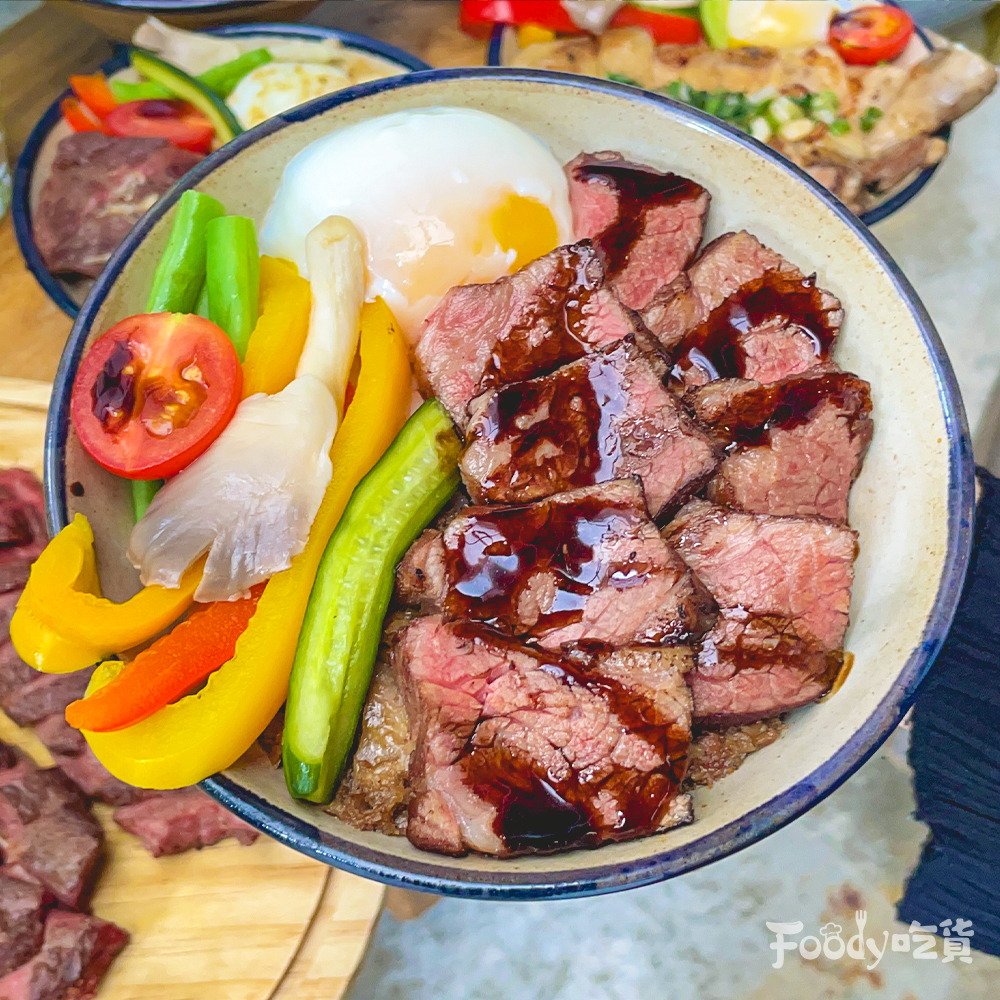 ▼「硬派主廚的軟嫩牛排飯」以丼飯形式呈現,大份量原肉牛排不手軟地鋪在飯上,搭配半熟溫泉蛋滋味超濃郁,肉香結合醬香、蛋香與蔬菜的清爽,一整個超下飯!