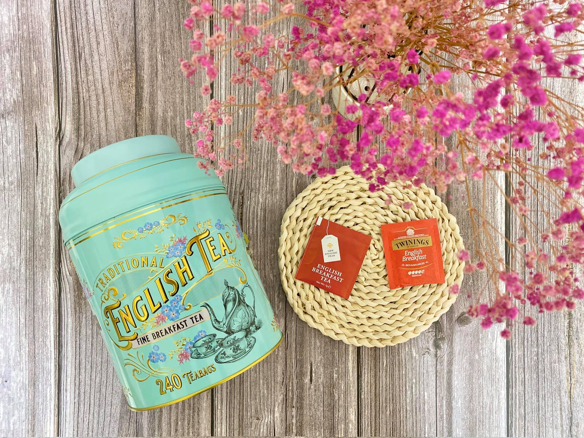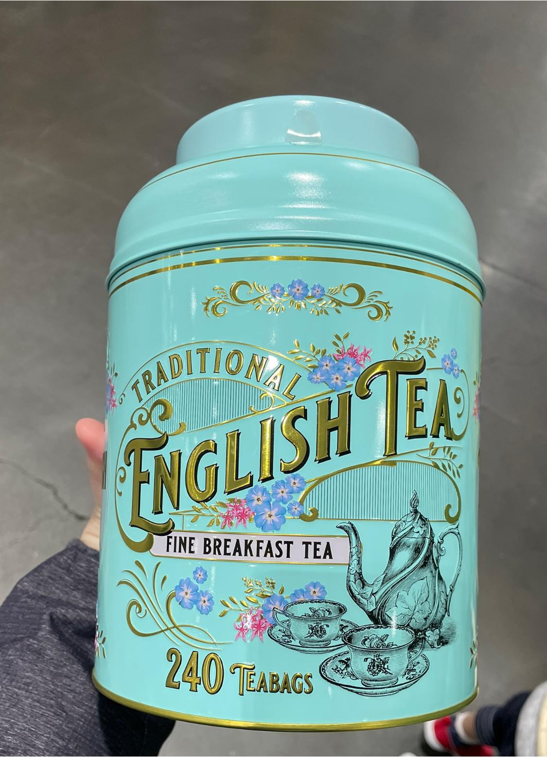▼Facebook好市多社團中網友們熱烈討頓的好市多商品「New English Breakfast Tea 早餐茶茶包」,售價599元/罐(240包),放大版的茶罐以夢幻蒂芬尼綠為主色調,精緻的金色雕花與英倫風花草茶具組的插畫,超有質感的包裝,根本是買茶罐送茶包的概念啊!