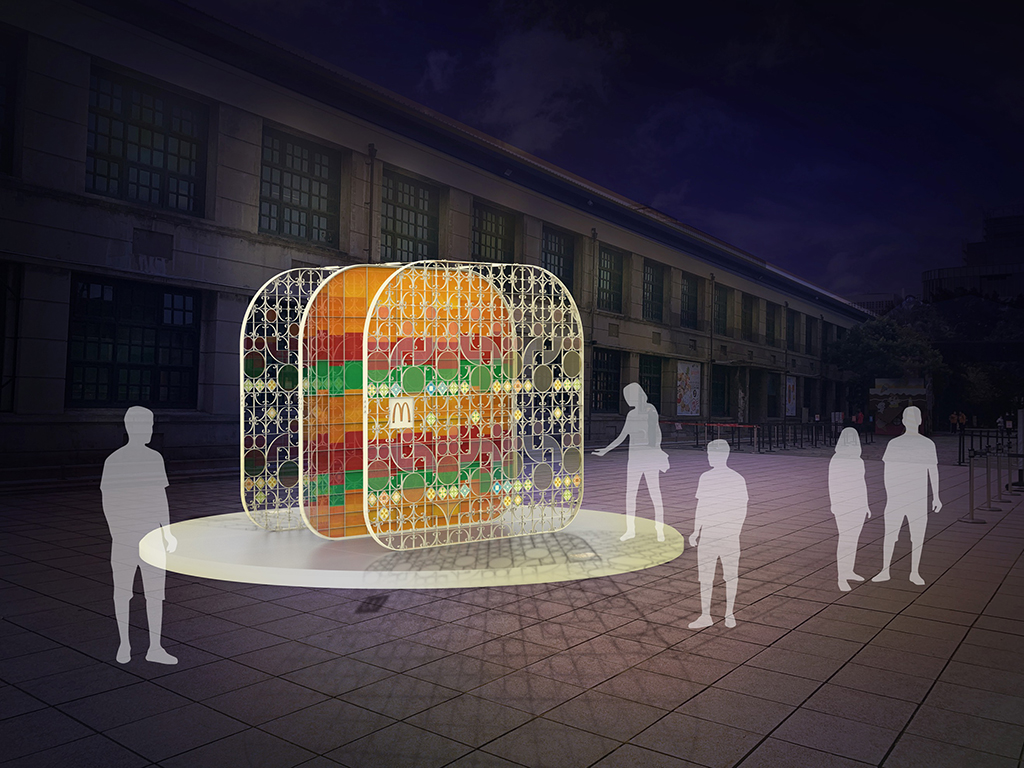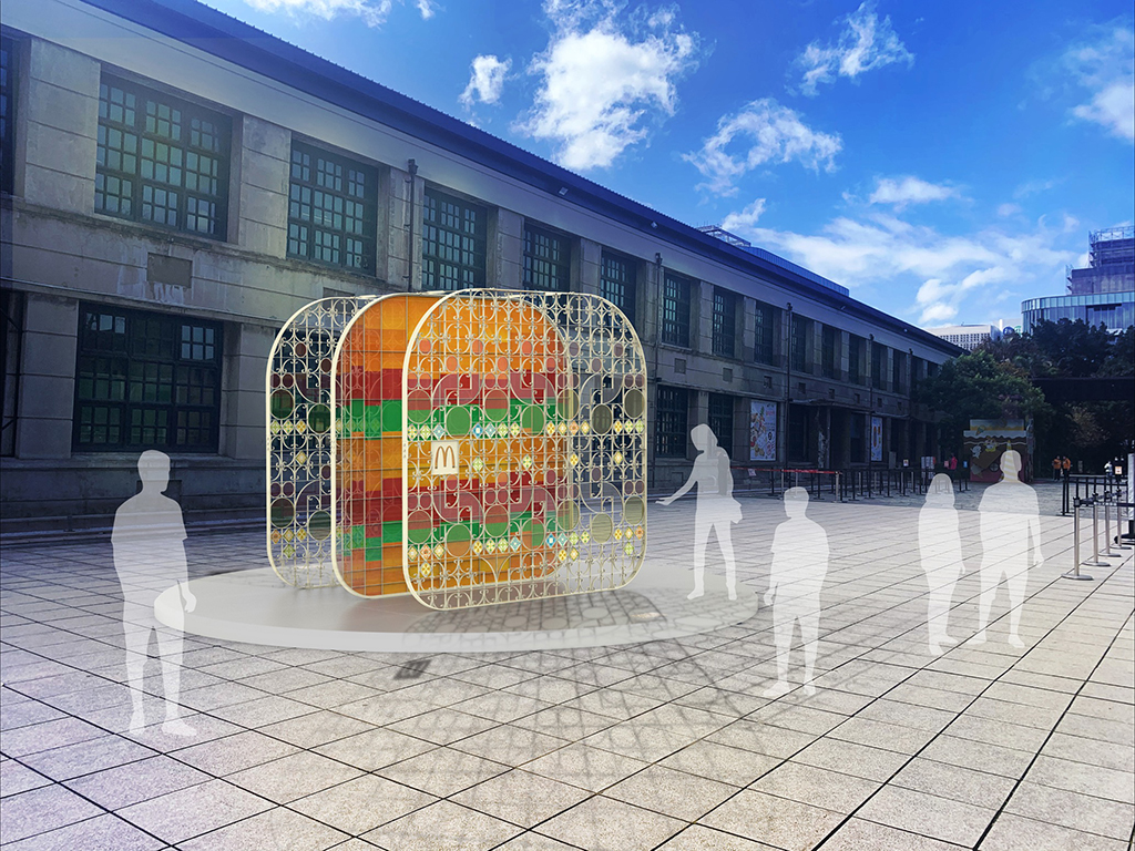 ▼台灣麥當勞攜手《白晝之夜》藝術創作團隊「步里赫森」,2月27日起至3月1日止,於松山文創園區,限期推出《城市印象大麥克》裝置藝術展,以探索台灣的城市風貌出發,找到大麥克誕生年代的台灣建築中,與光影共舞、最具代表的「花窗」作為主要設計元素,搭配「花磚」、「壓花玻璃」,利用多元媒材及複合製程,創造出巨型大麥克裝置藝術,呈現迷人光影效果。