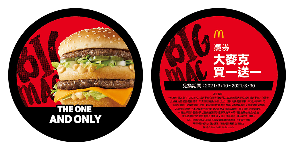 「大麥克買1送1兌換券」兌換時間為2021年3月10日至2021年3月30日。該券不可兌換無敵大麥克或培根大麥克。