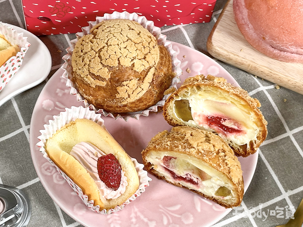 品項:湯種草莓麵包$30、草莓富士山$30、草莓閃電泡芙$30、草莓派司$30