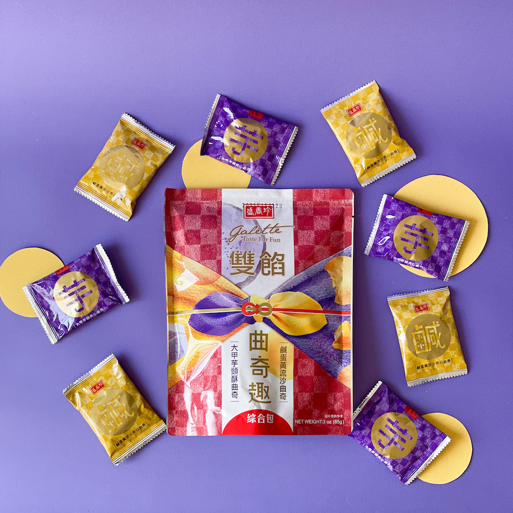 ▼「雙餡曲奇趣綜合包」(售價60元)全通路獨家商品,蛋奶素,內含經典鹹蛋黃+大甲芋頭酥夾心曲奇,嚴選大甲芋頭食材,流沙鹹蛋黃餡,添加紐西蘭奶油,小包裝設計方便分食。