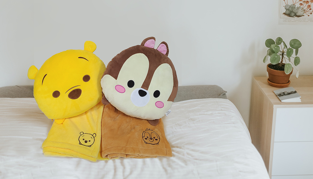 ▼超卡哇伊的迪士尼經典卡通明星:小熊維尼與奇奇造型,搭配Tsum Tsum萌萌風格,抱枕毛毯兩用設計,可抽出毛毯單獨使用,也可將毛毯置入抱枕內。抱枕絨毛細緻柔軟,毛毯質地輕柔,搭配主題電繡,是令人愛不釋手的居家設計單品。TsumTsum抱枕毯預購價為590元/款,粉絲們千萬別錯過!