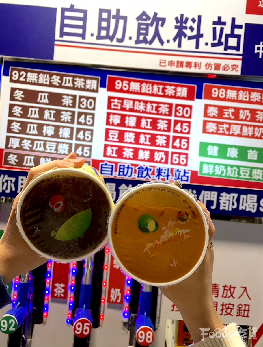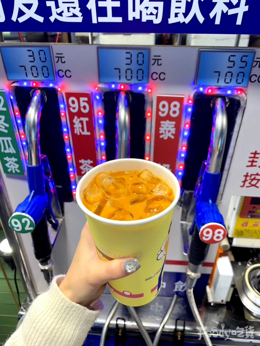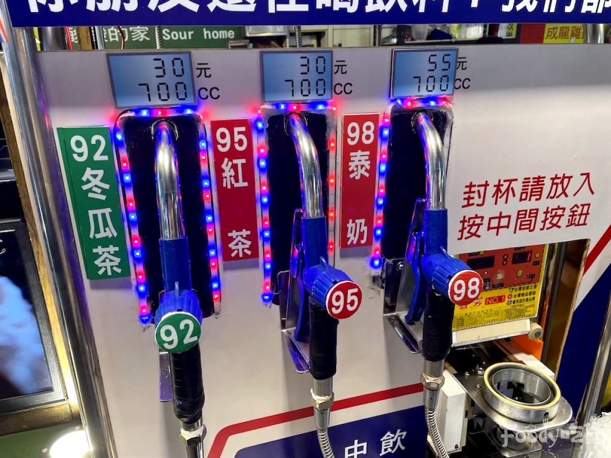 ▼「你朋友還在喝飲料?我們都喝98!」超鬧的標語下,還原了加油站的油槍,不過流出來的可是可以喝的飲料啊!飲料的名稱也很有趣,包括92冬瓜茶、95紅茶、98泰奶,很想問能不能打統編~