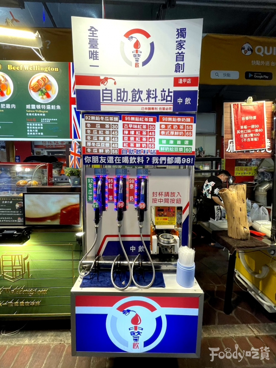 ▼來到逢甲夜市,就會發現這個新攤位前滿滿人潮啦!「中飲自助飲料站」標榜全台獨創的加油站喝飲料方式,想喝飲料自己來,超有自助加油站的感覺!