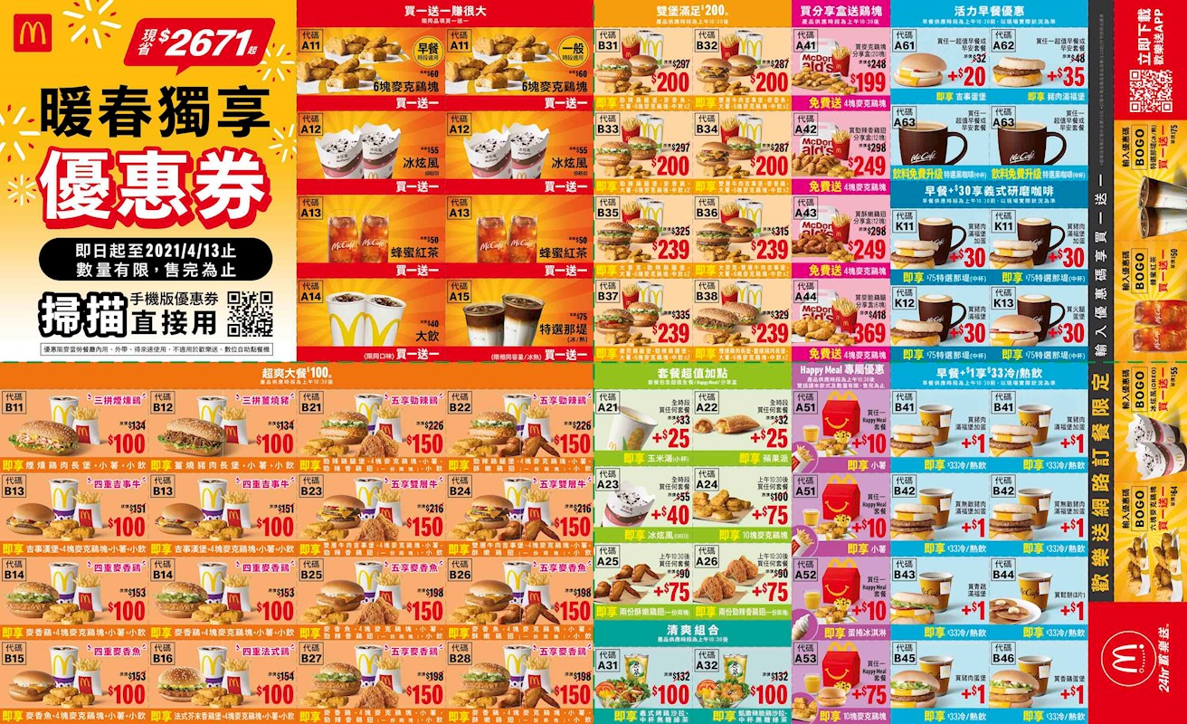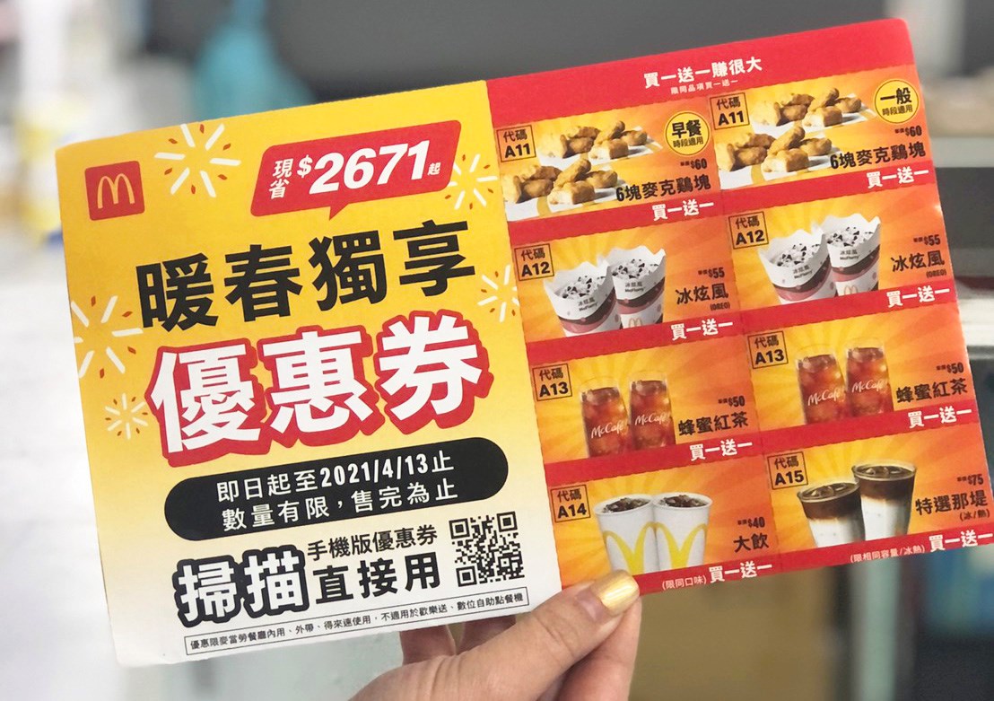 2021年03月08日小資族最愛的麥當勞優惠券又回來啦!麥當勞官網最新公告「暖春獨享優惠券」,超多優惠餐點組合等你大口爽吃,最高直接省下2671元,優惠期限只到4月13日截止,快把握這短短26天的優惠活動,一起去麥當勞大吃特吃吧~