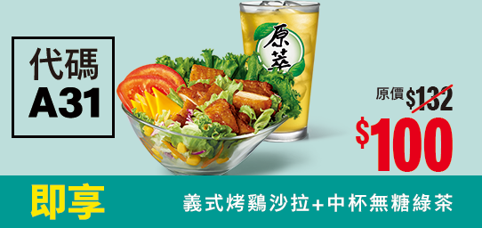 ▼另外還有多樣餐點組合,份量跟價格也非常划算,包括買分享盒就直接「免費送麥克鷄塊」的優惠;想要吃點低熱量餐點的朋友,還可以選擇「清爽組合」,只要100元就能買到義式烤雞沙拉+中杯無糖綠茶,直接現省32元!