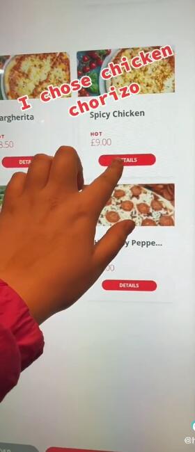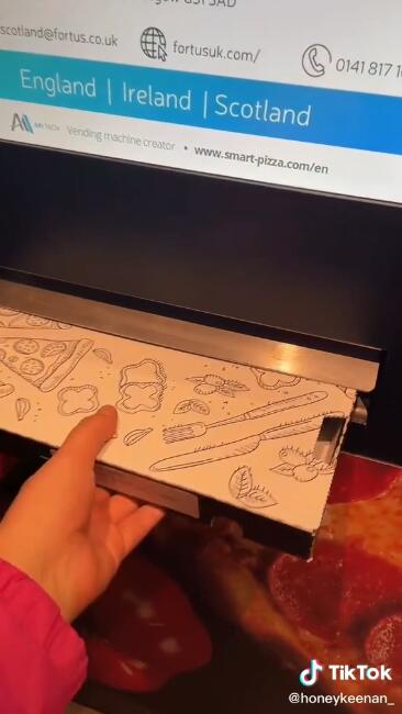 ▼最近在英國蘇格蘭格拉斯哥,一名女網友@Honeykeen_記錄下了在披薩自動販賣機上買披薩的過程,上傳到tiktok上後,已經有超過16萬網友點讚。從影片中可以看到,@Honeykeen_按照販賣機的指示選擇口味,她選擇了雞肉和西班牙香腸口味,要價9英鎊(約新台幣350元)。