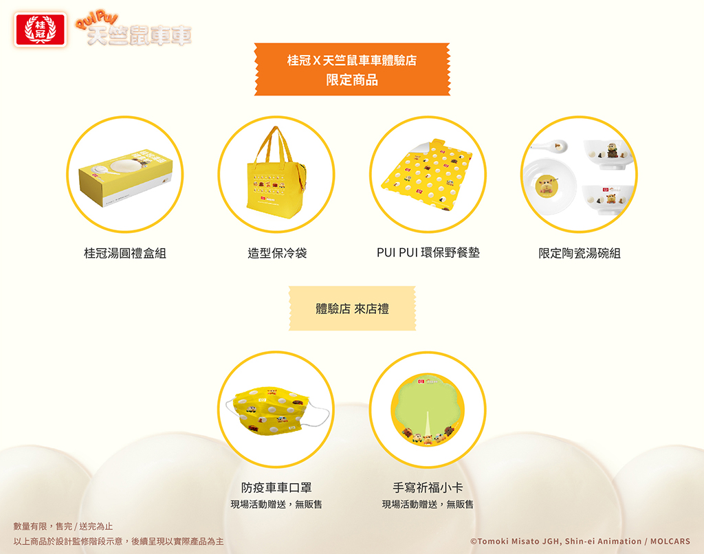 ▼除了祈福和佳餚之外,並展示各式周邊商品,包含「PUI PUI 造型野餐墊、限定陶瓷湯碗組、造型保冷袋、桂冠湯圓禮盒組」等多項限定商品,是僅有親臨現場的消費者才能進行預購。