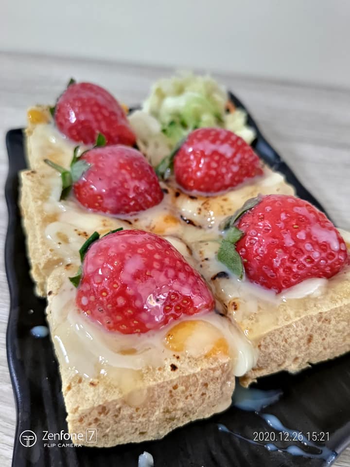 ▼鏘鏘!首先要介紹的是「草莓臭豆腐」,疊上起司一片、炙燒後再放上經典「草莓練乳」組合,草莓酸香直接取代經典台式泡菜,草莓控們是不是真愛就看這一口了~