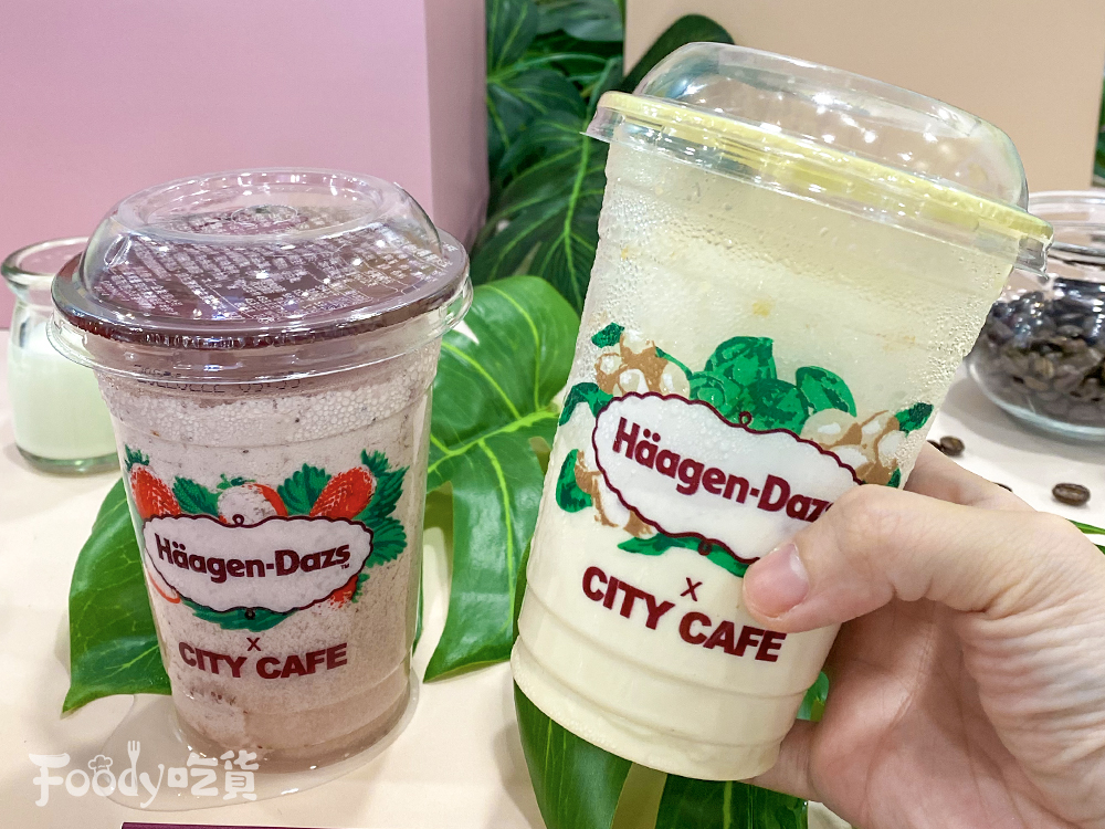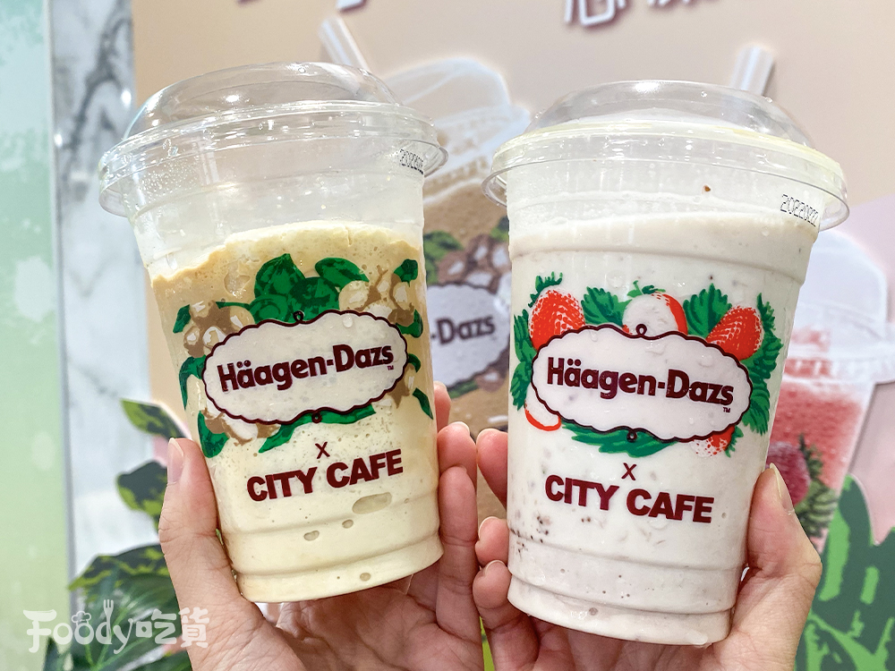 ▼「莓好拿鐵冰沙」(右)融入哈根達斯經典人氣款「草莓冰淇淋」,製成冰沙後加入CITY CAFE牛奶,香氣濃郁、口味酸甜適中,充滿飽滿果香與鮮甜滋味,還吃得到草莓果肉!