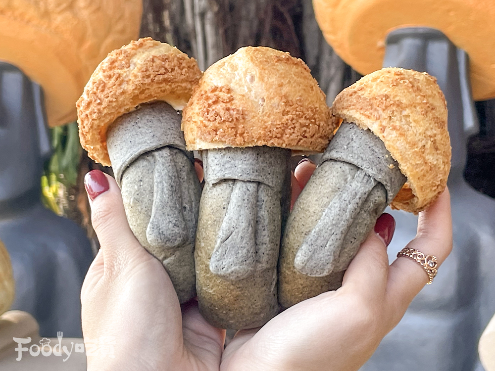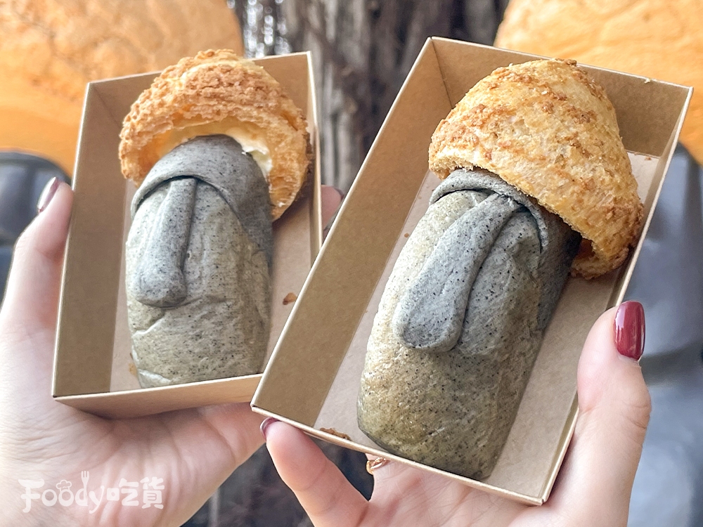 ▼呆萌的摩艾石擁有超高人氣,台中知名的「旅禾 泡芙之家」就以摩艾為意象,推出頭戴泡芙安全帽的摩艾麵包,泡芙安全帽外殼十分香酥,而摩艾本身則是軟糯的芝麻麵包,一口咬下是卡士達內餡,滑順又好吃!