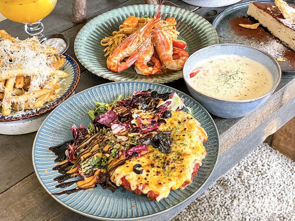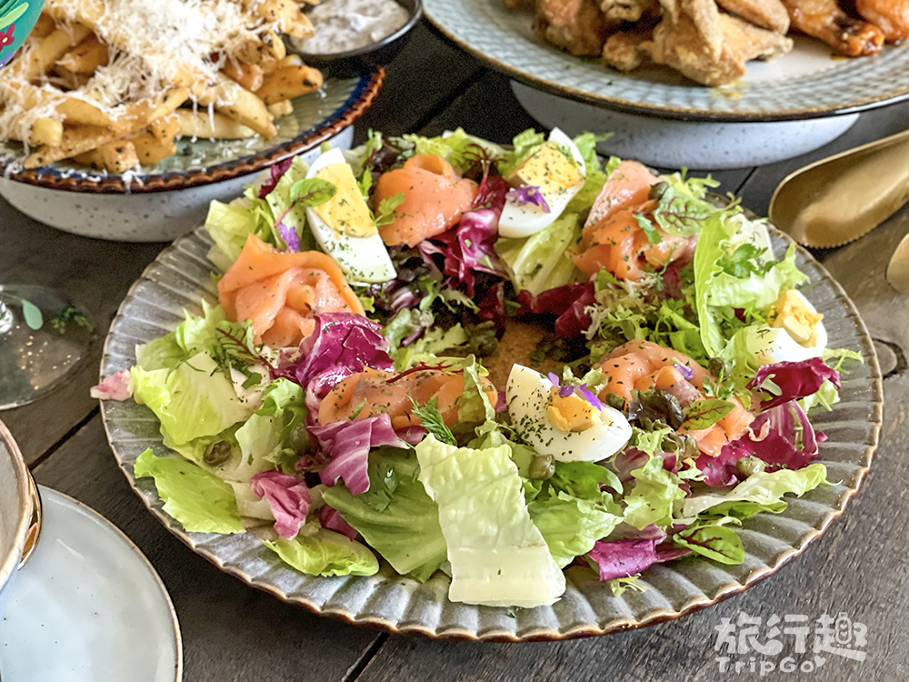 ▼想吃正餐類的餐點,GumGum也從開胃菜到甜點一應俱全,煙燻鮭魚沙拉鮮嫩的鮭魚搭配清爽生菜讓人食慾大開,還有超狂的「雞胸比薩」這滿滿的起司是不是有點太過分!