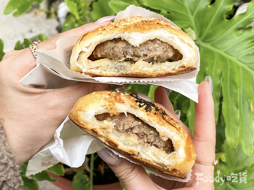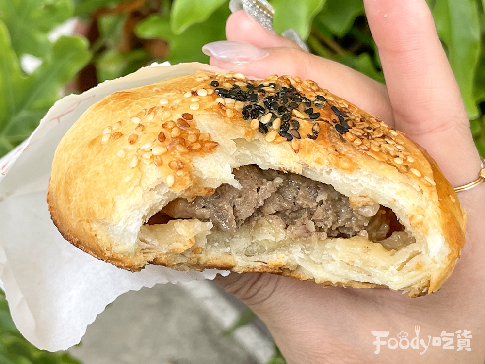 ▼驚人的剖面秀登場!胡椒餅的外皮相當酥脆,一口咬下可以吃得到餅皮和芝麻香,淡淡的胡椒香氣有些許的辣度,無論是搭配青蔥或是起司都超對味。而內餡的豬肉超扎實飽滿,肉汁也相當多,所以吃的時候要小心燙口。