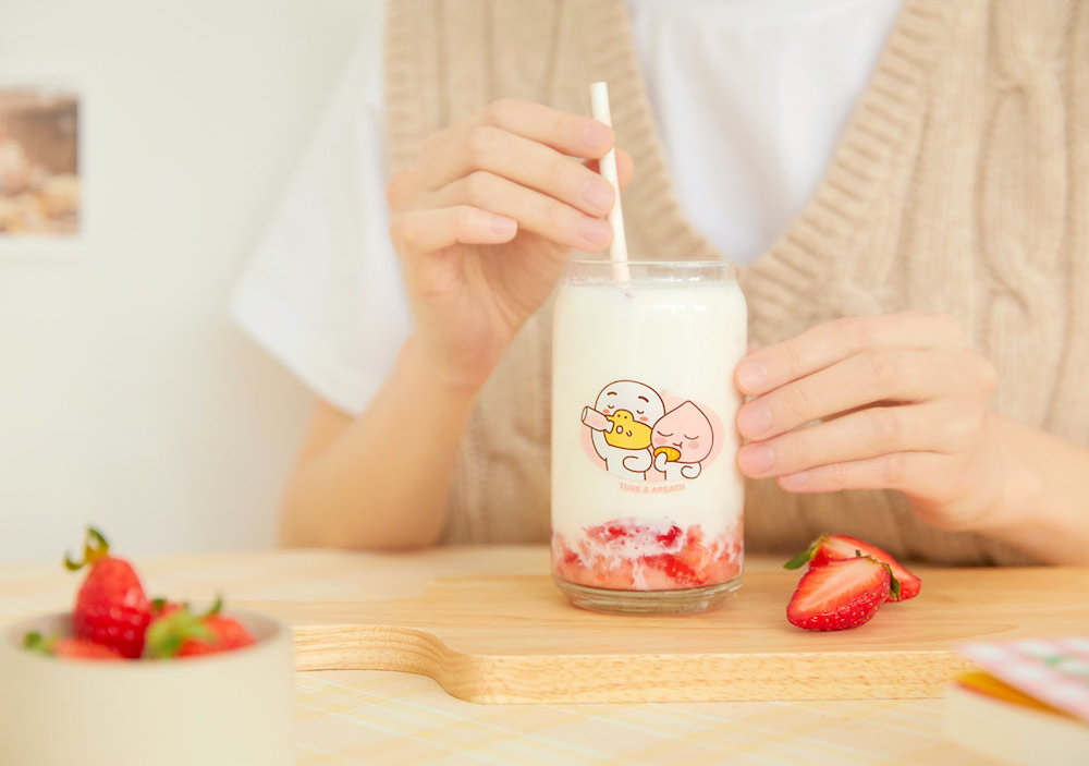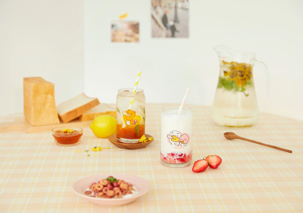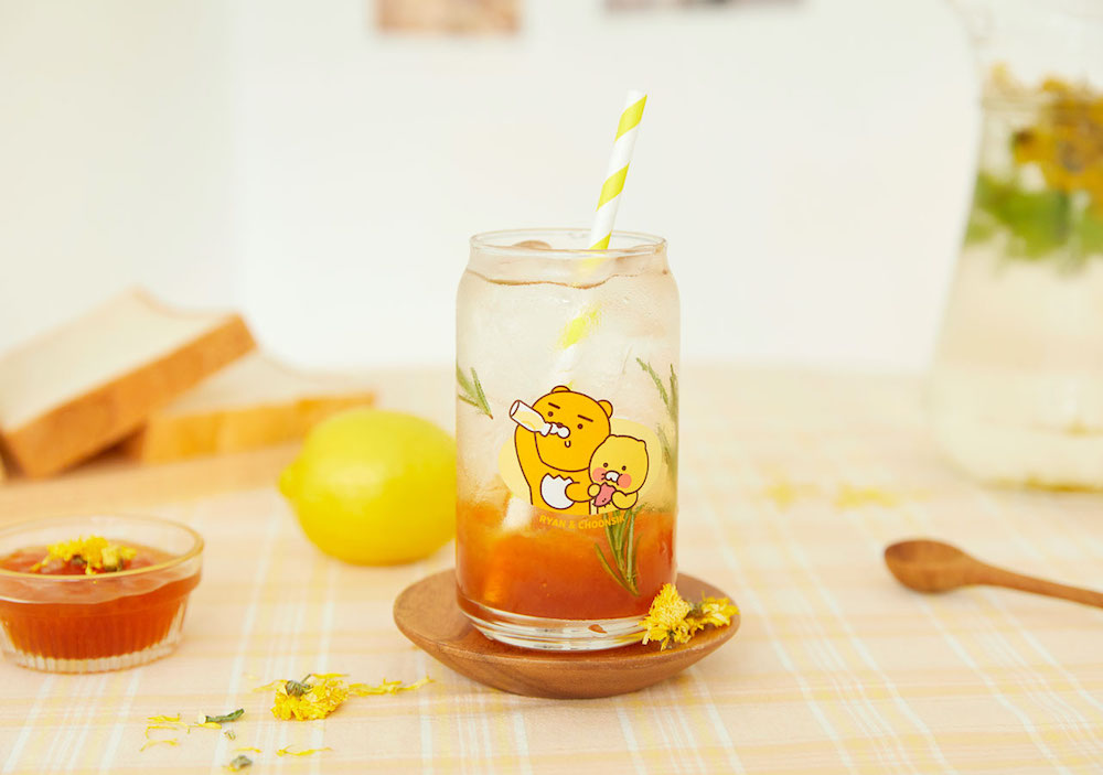 ▼早餐要喝飲料,那就順便把Kakao Friends玻璃杯一起收~萊恩喝飲料賣萌的樣子實在有點可愛得太過分了喔~