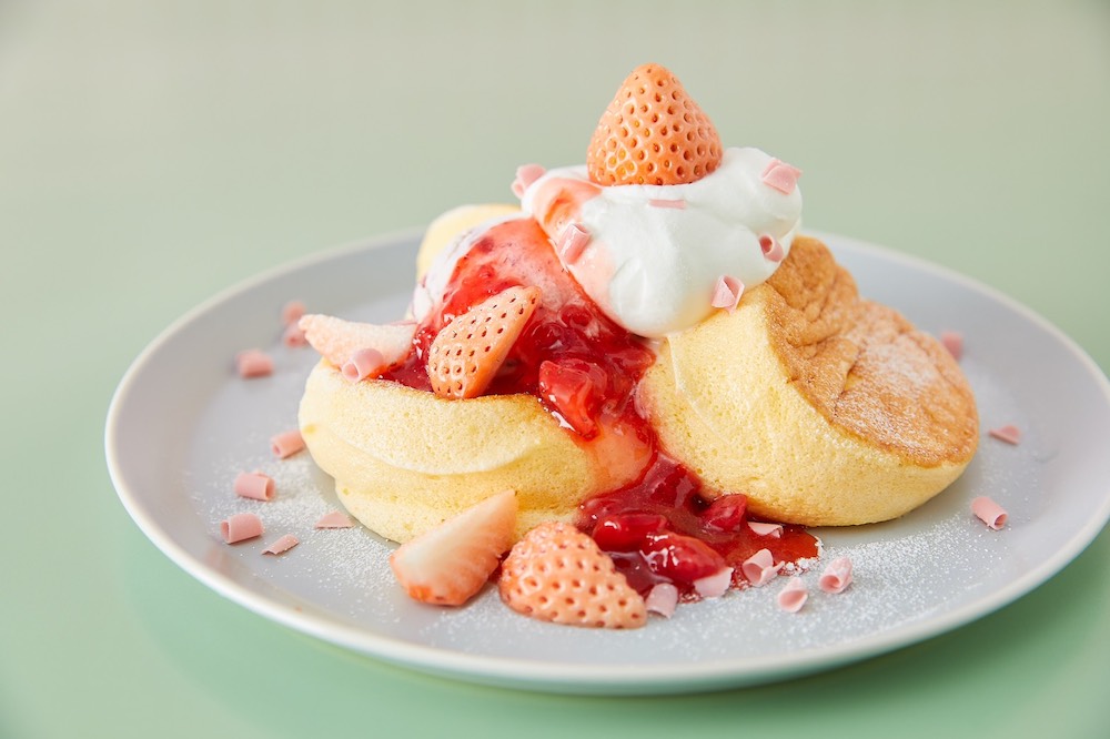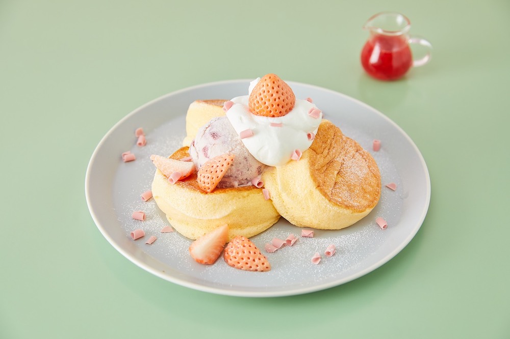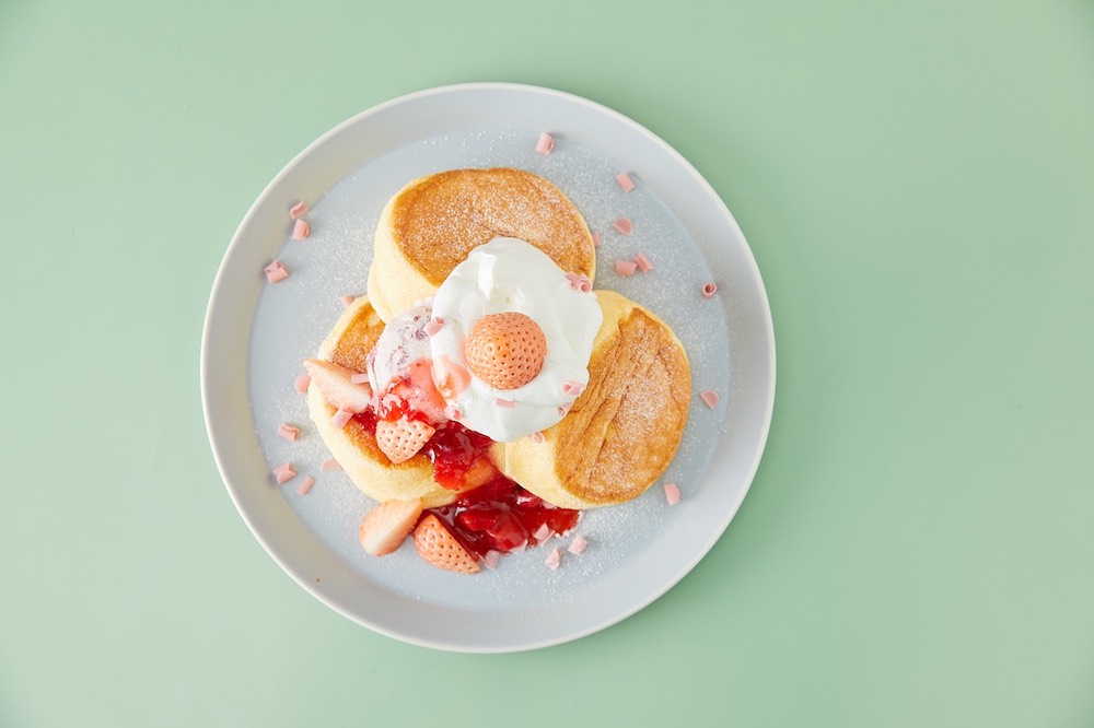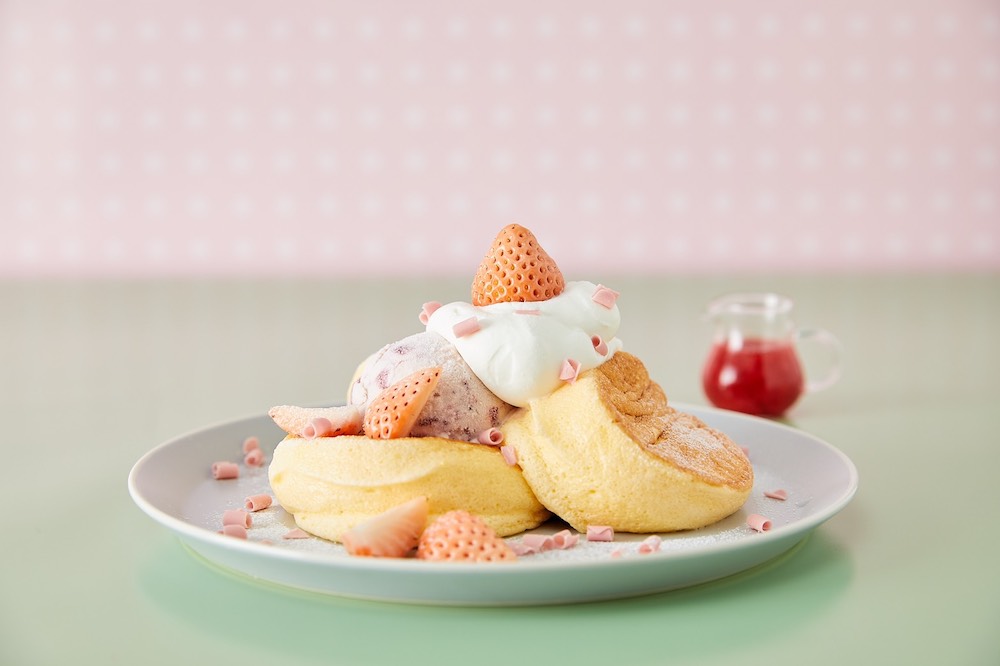 ▼「奇蹟的舒芙蕾鬆餅 雪兔白草莓」使用品種稀少珍貴的雪兔白草莓呈現春季限定商品,搭配定番的香濃北海道鮮奶油以及粉色巧克力碎片,淋上自製的酸甜莓果醬襯托散發淡淡香氣的白草莓,在美好初春享受酸甜粉嫩的視覺及味覺饗宴!