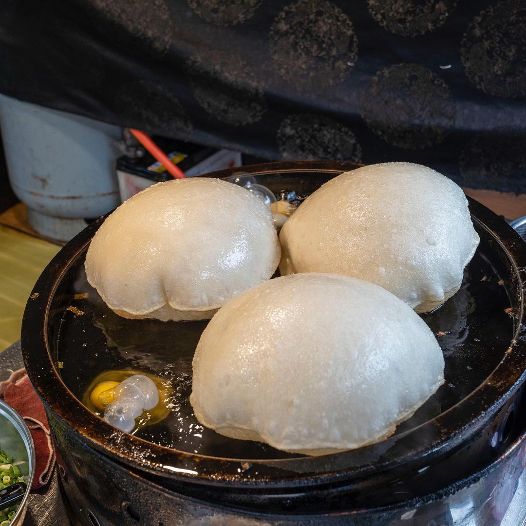 ▼雖然沒辦法在「皮球」的狀態下享用,但是在油鍋裡經過歷練後,一口咬下蔥油餅表層酥脆,內層Q彈又充滿麵香,搭配嫩蛋與清脆爽口的蔥,超大份量嗑完實在太滿足!