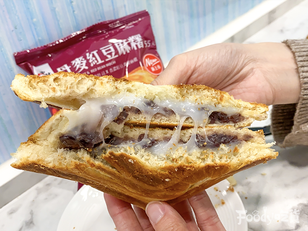 ▼「丹麥紅豆麻糬熱壓吐司」售價 55 元,千層丹麥吐司口感外酥內軟,使用紐西蘭進口奶油,使用國產萬丹紅豆熬製、香濃紅豆餡料搭配Q彈麻糬,熱壓後香氣濃郁。