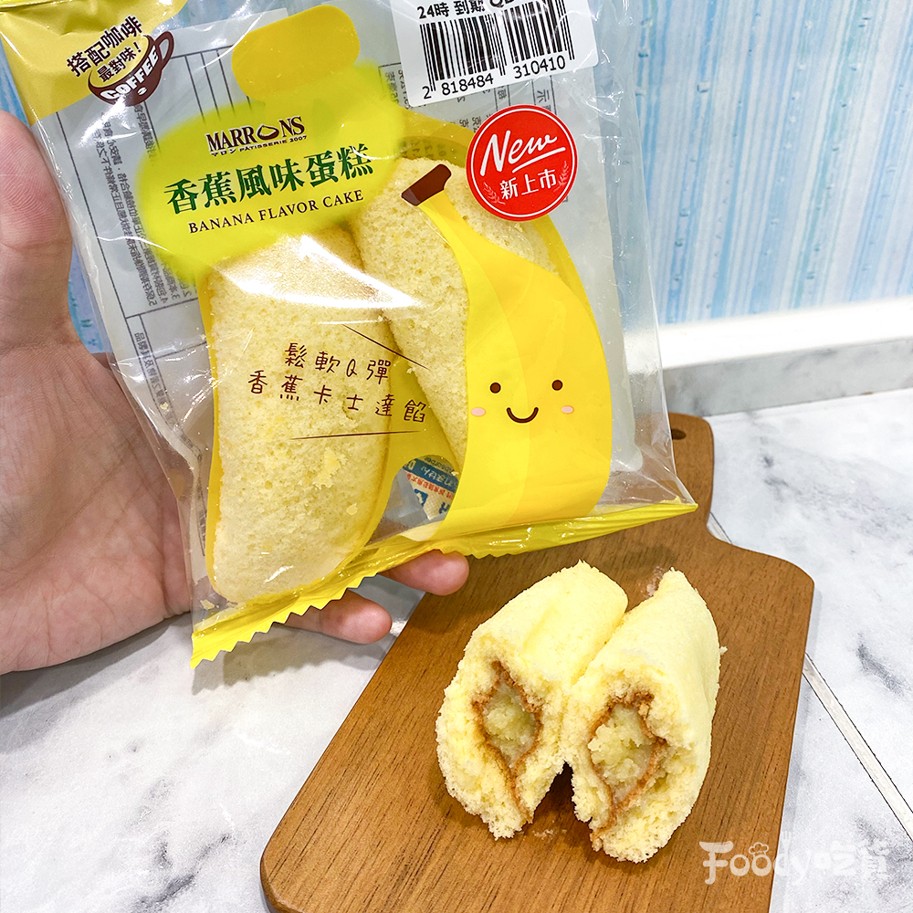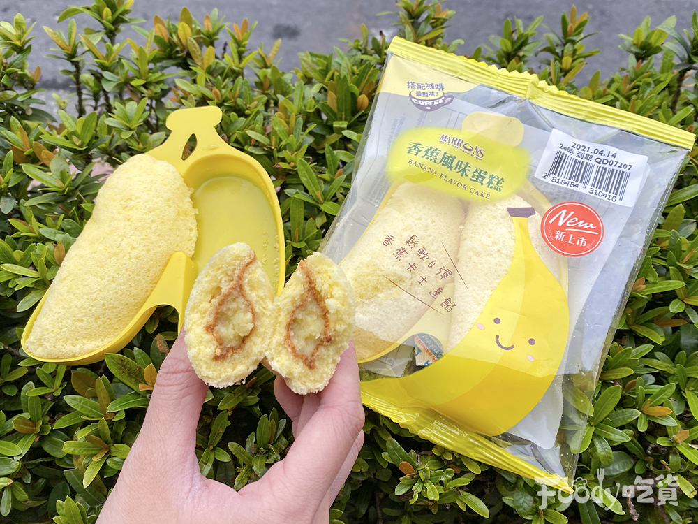 ▼「香蕉風味蛋糕」售價 39 元,口感鬆軟海綿蛋糕體,搭配日本進口卡士達粉及奶油,調製帶淡淡蕉,香卡士達滑順內餡,搭配香蕉造型襯盒吸睛。