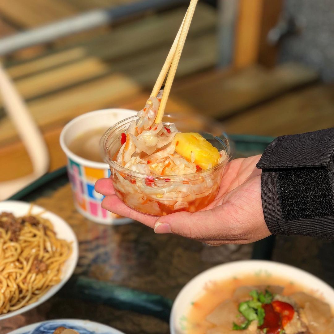 ▼不少人到「尤家炒麵」必點的就是這份「1號餐」,「1號餐」的組合內有肉圓+甜不辣+蘿蔔貢丸湯真的超澎湃!看看這肉圓Q彈的外皮搭配紮實的肉塊和切丁竹筍,實在是太欠吃啦!